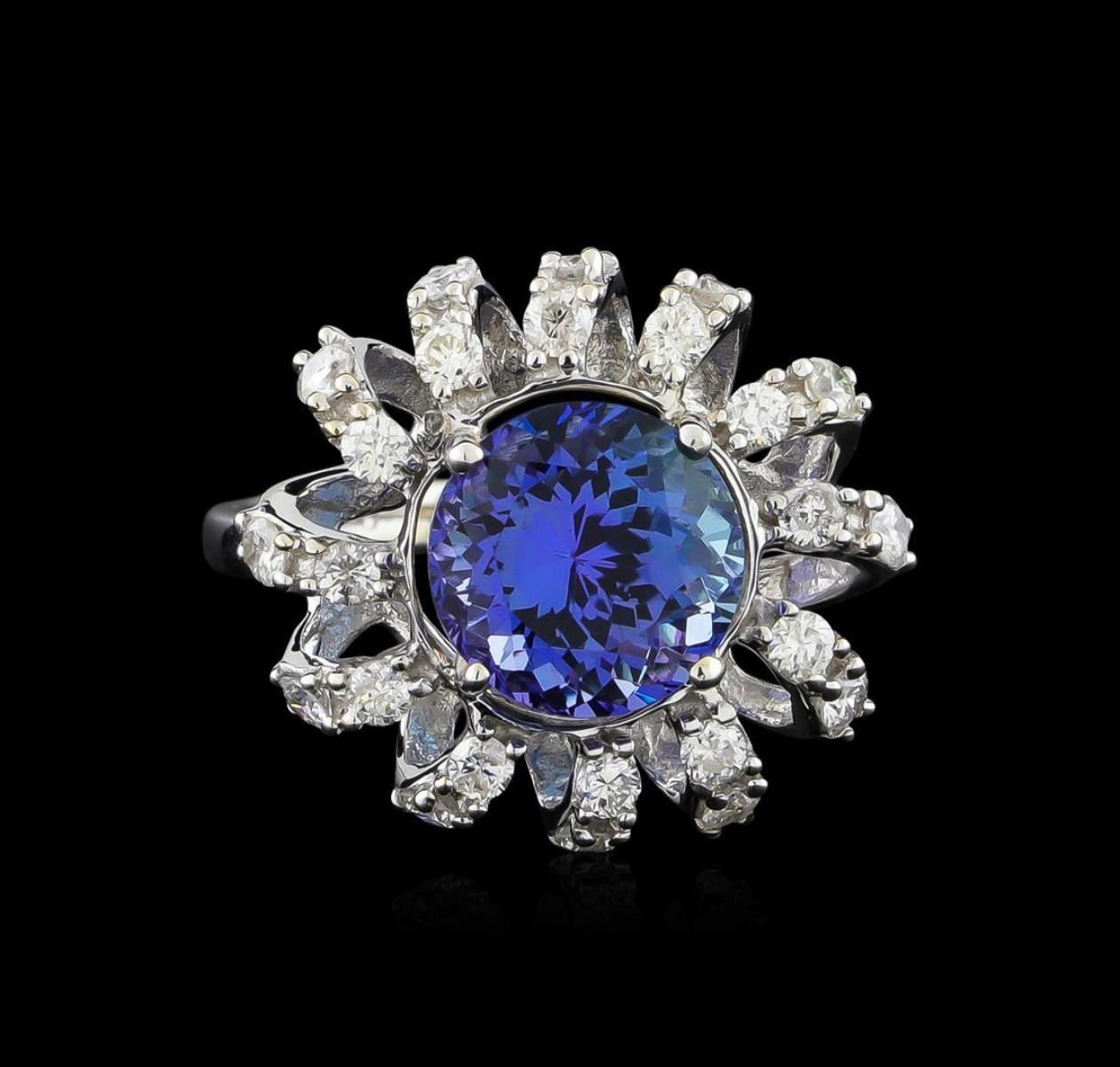 One electronically tested 14KT white gold ladies combination cast & assembled tanzanite and diamond ring with a flat shank with a bright polish finish. Identified with markings of "14K". Condition is new. Containing: One prong set round modified brilliant cut natural tanzanite, measuring 9.17 - 9.16 x 5.96 mm, approximate weight of 3.36ct., clarity is eye clean, type I, medium, very slightly grayish, violet color, (GIA V 5/3), cut is good. Twenty-Four prong set round brilliant cut diamonds, measuring 1.90 - 1.80 x 1.11mm (depth est.) approximate total weight of 24 Stones = 0.55ct. Clarity: SI-1 to I-1. Color: I - J, Cut is Good. Colored gemstones are presumed to have been subjected to commonly used enhancement processes. All diamonds and colored gemstones are graded in the mounting, unless otherwise stated. Total Weight of Colored Stones 3.36ct. Total Weight of Diamonds 0.55ct. Total Weight of Ring 4.70 grams. GGL Appraised.