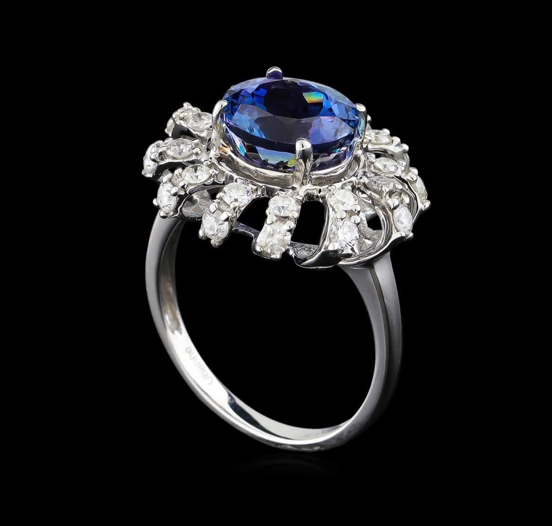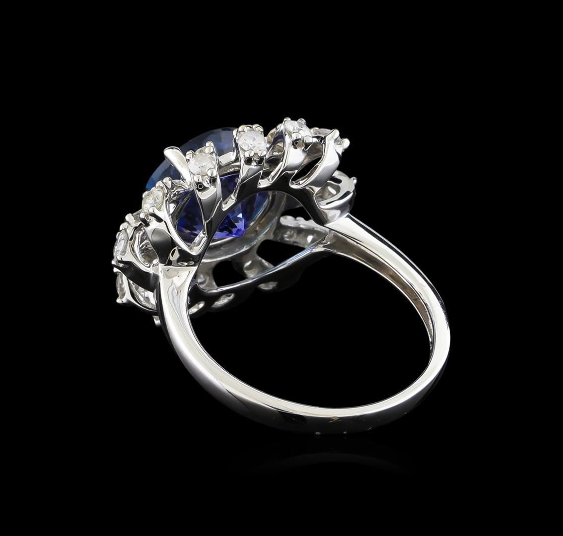 One electronically tested 14KT white gold ladies combination cast & assembled tanzanite and diamond ring with a flat shank with a bright polish finish. Identified with markings of "14K". Condition is new. Containing: One prong set round modified brilliant cut natural tanzanite, measuring 9.17 - 9.16 x 5.96 mm, approximate weight of 3.36ct., clarity is eye clean, type I, medium, very slightly grayish, violet color, (GIA V 5/3), cut is good. Twenty-Four prong set round brilliant cut diamonds, measuring 1.90 - 1.80 x 1.11mm (depth est.) approximate total weight of 24 Stones = 0.55ct. Clarity: SI-1 to I-1. Color: I - J, Cut is Good. Colored gemstones are presumed to have been subjected to commonly used enhancement processes. All diamonds and colored gemstones are graded in the mounting, unless otherwise stated. Total Weight of Colored Stones 3.36ct. Total Weight of Diamonds 0.55ct. Total Weight of Ring 4.70 grams. GGL Appraised.
