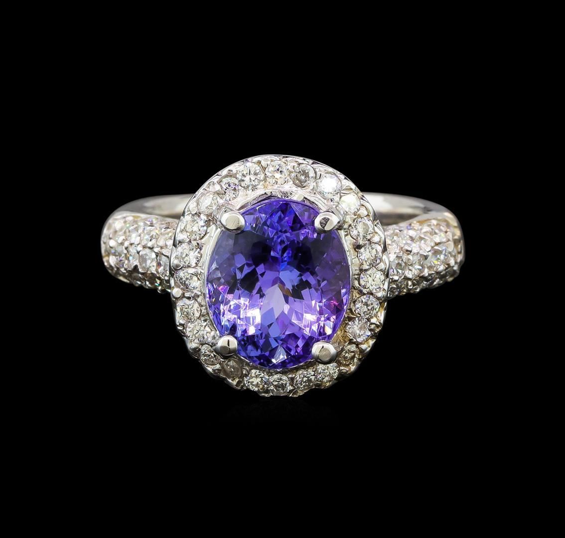 One electronically tested 14KT white gold ladies cast tanzanite and diamond ring with a bright polish finish. Condition is new. Containing: One prong set oval modified brilliant cut natural tanzanite, measuring 10.20 x 8.50 x 5.53mm, approximate weight of 3.37ct., clarity is eye clean, type I, medium light, very slightly grayish, violet color, (GIA V 4/3), cut is good. Sixty-Three prong set round brilliant cut diamonds, measuring 1.50 - 1.50 x 0.90mm (depth est.) approximate total weight of 63 Stones = 0.78ct. Clarity: SI-2 to I-1. Color: I - J, Cut is Good. Colored gemstones are presumed to have been subjected to commonly used enhancement processes. All diamonds and colored gemstones are graded in the mounting, unless otherwise stated. Total Weight of Colored Stones 3.37ct. Total Weight of Diamonds 0.78ct. Total Weight of Ring 7.40 grams. GGL Appraised.