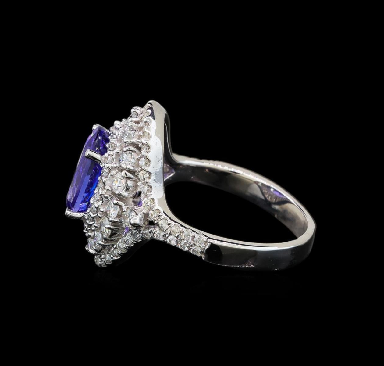 One electronically tested 14KT white gold ladies cast tanzanite and diamond ring with a bright polish finish. Identified with markings of "14K". Condition is new. Containing: One prong set oval modified brilliant cut natural tanzanite, measuring 10.00 x 8.00 x 5.20mm, approximate weight of 3.40ct., clarity is eye clean, type I, medium, moderately strong, violet color, (GIA V 5/4), cut is good. Ninety-Six prong set round brilliant cut diamonds, measuring 2.40 - 1.30 x 1.11mm (depth est.) approximate total weight of 96 Stones = 1.23ct. Clarity: SI-1 to I-1. Color: H - I, Cut is Good. Colored gemstones are presumed to have been subjected to commonly used enhancement processes. All diamonds and colored gemstones are graded in the mounting, unless otherwise stated. Total Weight of Colored Stones 3.40ct. Total Weight of Diamonds 1.23ct. Total Weight of Ring 5.90 grams. GGL Appraised.