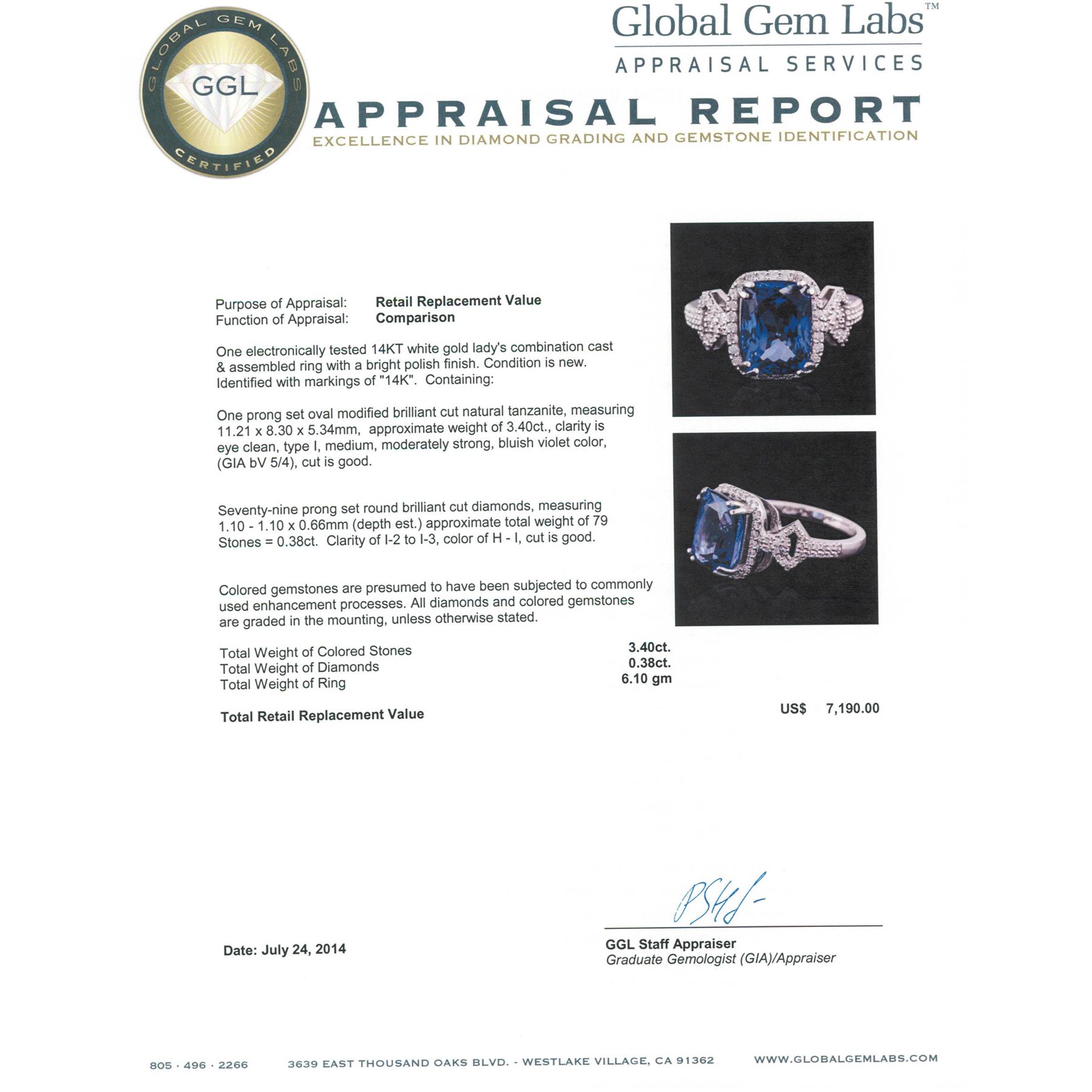 One electronically tested 14KT white gold ladies combination cast & assembled ring with a bright polish finish. Condition is new. Identified with markings of "14K". Containing: One prong set oval modified brilliant cut natural tanzanite, measuring 11.21 x 8.30 x 5.34mm, approximate weight of 3.40 ct., clarity is eye clean, type I, medium, moderately strong, bluish violet color, (GIA bV 5/4), cut is good. Seventy-Nine prong set round brilliant cut diamonds, measuring 1.10 - 1.10 x 0.66mm (depth est.) approximate total weight of 79 Stones = 0.38ct. Clarity: I-2 to I-3. Color: H - I, Cut is Good. Colored gemstones are presumed to have been subjected to commonly used enhancement processes. All diamonds and colored gemstones are graded in the mounting, unless otherwise stated. Total Weight of Colored Stones 3.40 ct. Total Weight of Diamonds 0.38ct. Total Weight of Ring 6.10 grams. GGL Appraised.