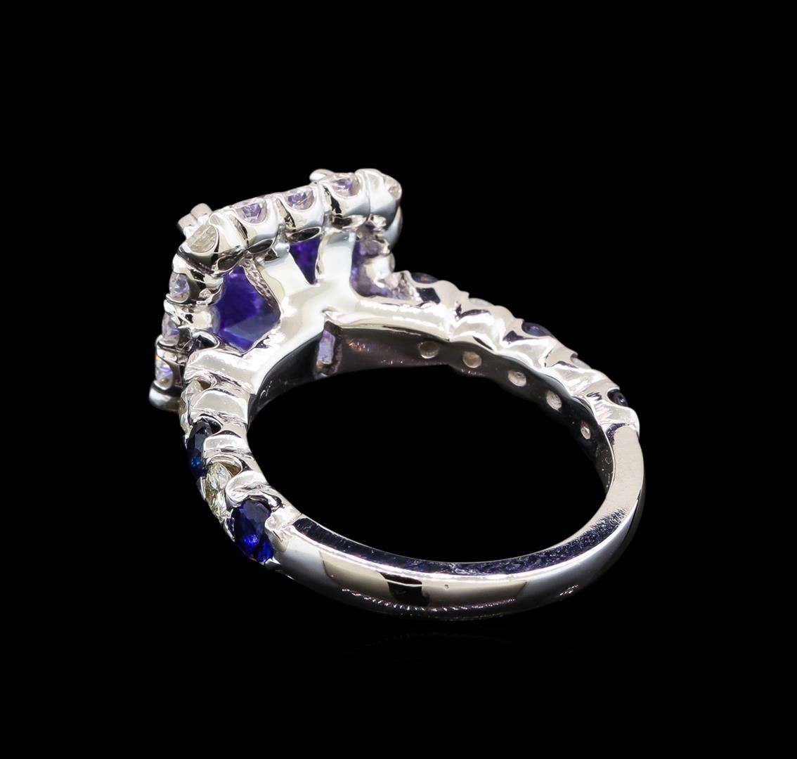 One electronically tested 14KT white gold ladies cast tanzanite, sapphire and diamond ring with a bright polish finish. Identified with markings of "14K". Condition is new. Containing: One prong set square cushion modified mixed cut natural tanzanite, measuring 8.80 x 8.80 x 5.72mm, approximate weight of 3.49ct., clarity is eye clean, type I, medium light, slightly grayish, violet color, (GIA V 4/2), cut is good. Six prong set round modified brilliant cut natural blue sapphires, measuring 3.00 - 3.00 x 1.95 mm, approximate total weight of 0.84ct., clarity is slightly included, type II, medium, very slightly grayish, blue color, (GIA B 5/3), cut is good. Twenty prong set round brilliant cut diamonds, measuring 2.50 - 2.00 x 1.35mm (depth est.) approximate total weight of 20 Stones = 0.83ct. Clarity: SI-1 to I-1. Color: J, Cut is Good. Colored gemstones are presumed to have been subjected to commonly used enhancement processes. All diamonds and colored gemstones are graded in the mounting, unless otherwise stated. Total Weight of Colored Stones 4.33ct. Total Weight of Diamonds 0.83ct. Total Weight of Ring 5.60 grams. GGL Appraised.