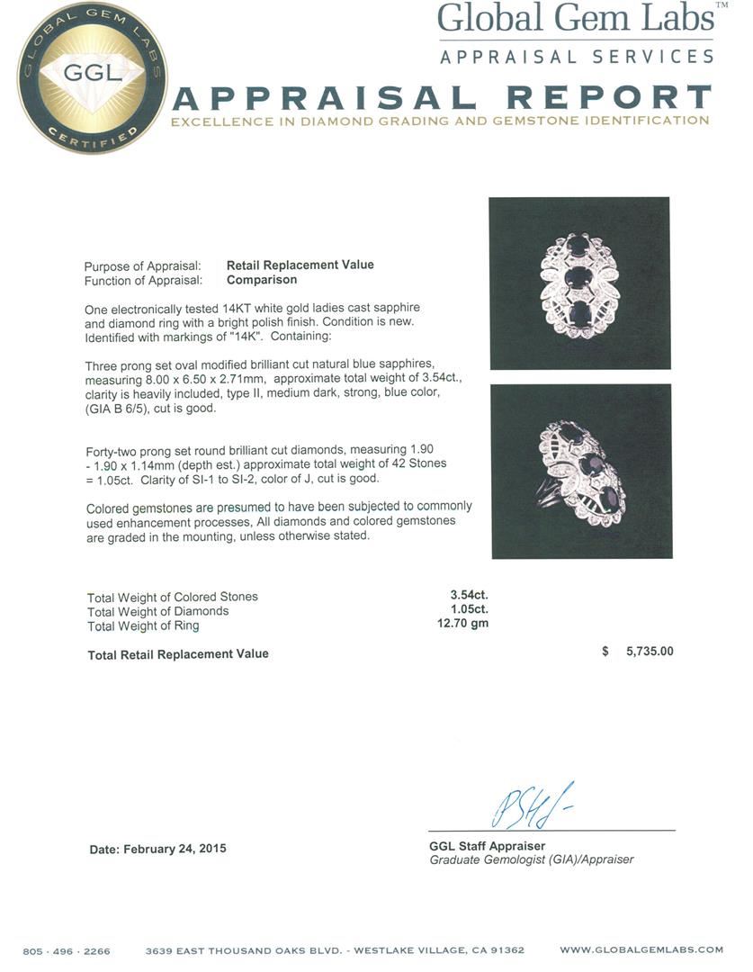 One electronically tested 14KT white gold ladies cast sapphire and diamond ring with a bright polish finish. Identified with markings of "14K". Condition is new. Containing: Three prong set oval modified brilliant cut natural blue sapphires, measuring 8.00 x 6.50 x 2.71mm, approximate total weight of 3.54ct., clarity is heavily included, type II, medium dark, strong, blue color, (GIA B 6/5), cut is good. Forty-Two prong set round brilliant cut diamonds, measuring 1.90 - 1.90 x 1.14mm (depth est.) approximate total weight of 42 Stones = 1.05ct. Clarity: SI-1 to SI-2. Color: J, Cut is Good. Colored gemstones are presumed to have been subjected to commonly used enhancement processes, All diamonds and colored gemstones are graded in the mounting, unless otherwise stated. Total Weight of Colored Stones 3.54ct. Total Weight of Diamonds 1.05ct. Total Weight of Ring 12.70 grams. GGL Appraised.