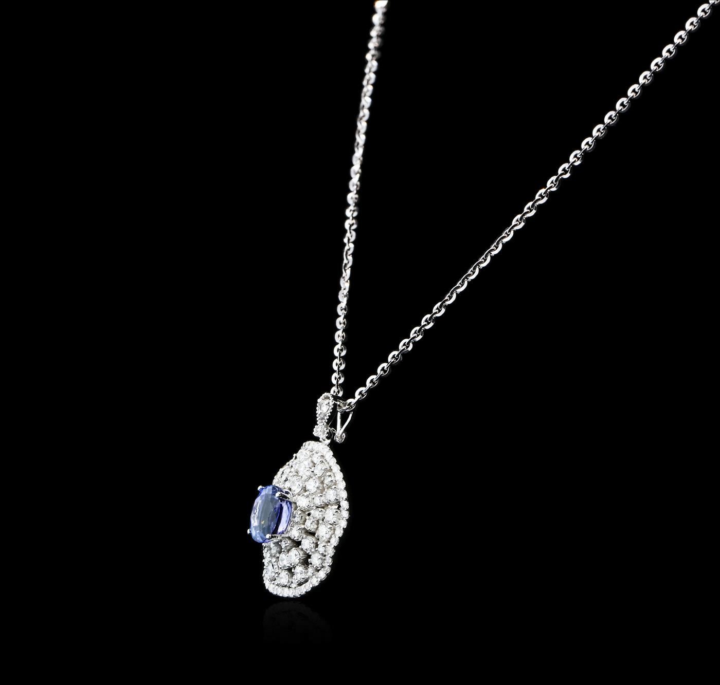 One electronically tested 14KT white gold ladies combination cast & assembled tanzanite and diamond pendant & chain 18.0" long, cable link with a lobster claw clasp with a bright polish finish. Identified with markings of "K14". Condition is new. Containing: One prong set oval modified brilliant cut natural tanzanite, measuring 10.00 x 8.15 x 6.23mm, approximate weight of 3.57ct., clarity is eye clean, type I, medium light, slightly grayish, violet color, (GIA V 4/2), cut is good. Forty-Nine prong set round brilliant cut diamonds, measuring 2.50 - 2.50 x 1.50mm (depth est.) approximate total weight of 49 Stones = 2.80ct. Clarity: SI-1. Color: J - K, Cut is Good. Fifty-Five prong set round brilliant cut diamonds, measuring 1.50 - 1.50 x 0.90mm (depth est.) approximate total weight of 55 Stones = 0.68ct. Clarity: SI-1 to I-1. Color: J - K, Cut is Good. All diamonds and colored gemstones are graded in the mounting, unless otherwise stated. Colored gemstones are presumed to have been subjected to commonly used enhancement processes. Total Weight of Colored Stones 3.57ct. Total Weight of Diamonds 3.48ct. Total Weight of Pendant & Chain 15.80 grams. GGL Appraised.