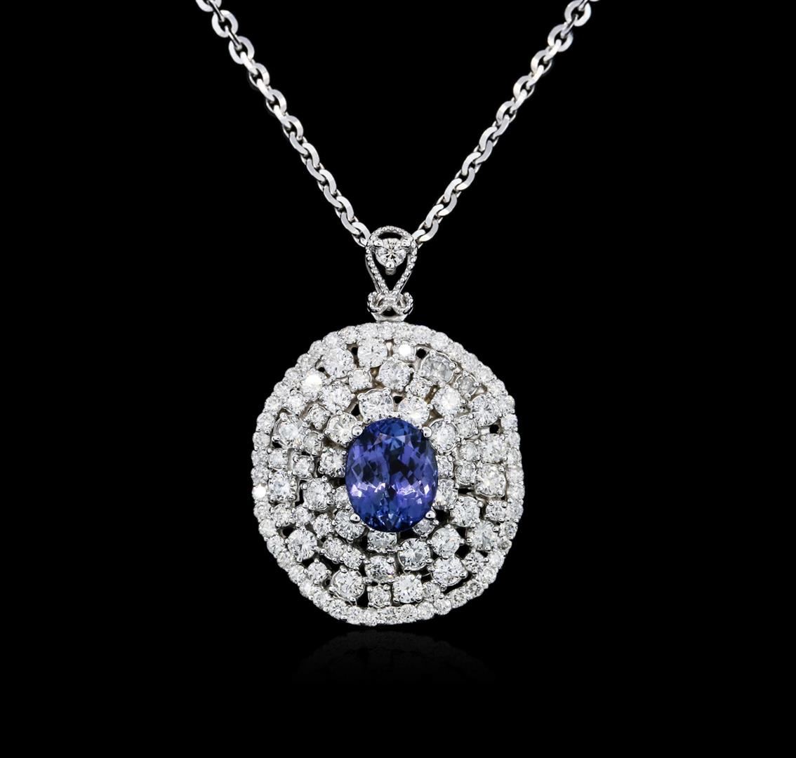 One electronically tested 14KT white gold ladies combination cast & assembled tanzanite and diamond pendant & chain 18.0" long, cable link with a lobster claw clasp with a bright polish finish. Identified with markings of "K14". Condition is new. Containing: One prong set oval modified brilliant cut natural tanzanite, measuring 10.00 x 8.15 x 6.23mm, approximate weight of 3.57ct., clarity is eye clean, type I, medium light, slightly grayish, violet color, (GIA V 4/2), cut is good. Forty-Nine prong set round brilliant cut diamonds, measuring 2.50 - 2.50 x 1.50mm (depth est.) approximate total weight of 49 Stones = 2.80 ct. Clarity: SI-1. Color: J - K, Cut is Good. Fifty-Five prong set round brilliant cut diamonds, measuring 1.50 - 1.50 x 0.90mm (depth est.) approximate total weight of 55 Stones = 0.68ct. Clarity: SI-1 to I-1. Color: J - K, Cut is Good. All diamonds and colored gemstones are graded in the mounting, unless otherwise stated. Colored gemstones are presumed to have been subjected to commonly used enhancement processes. Total Weight of Colored Stones 3.57ct. Total Weight of Diamonds 3.48ct. Total Weight of Pendant & Chain 15.80 grams. GGL Appraised.