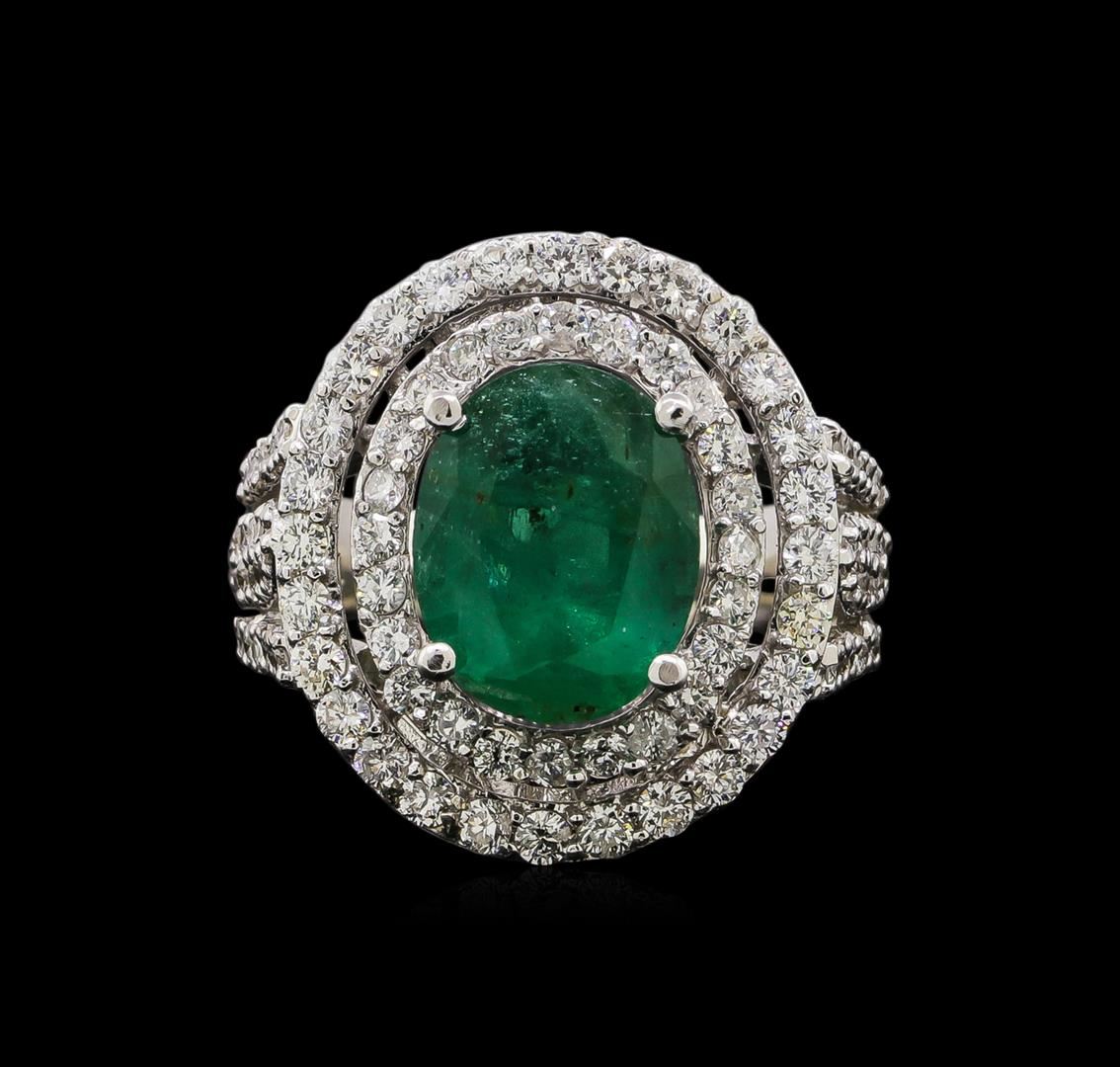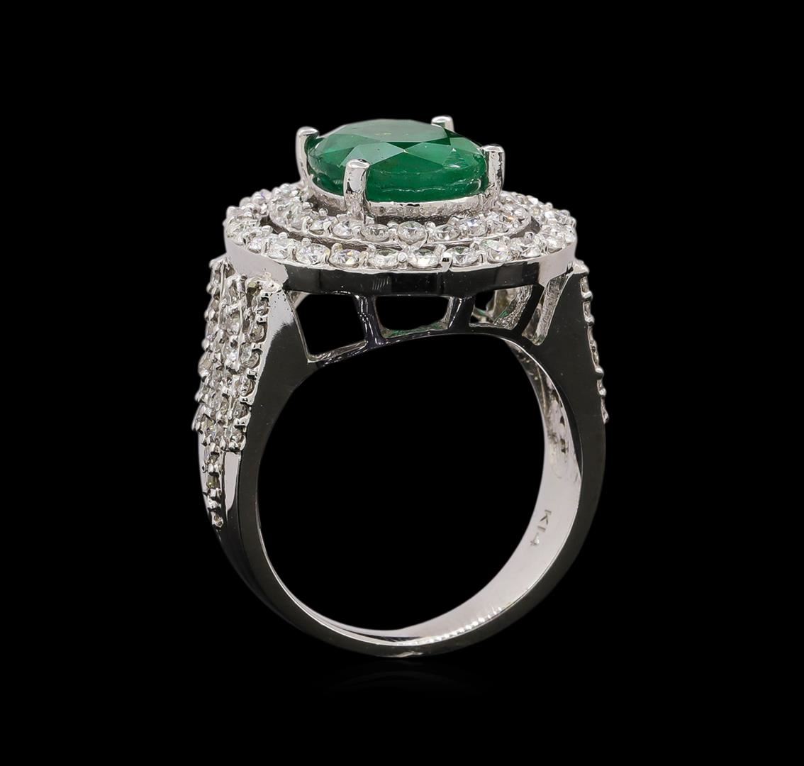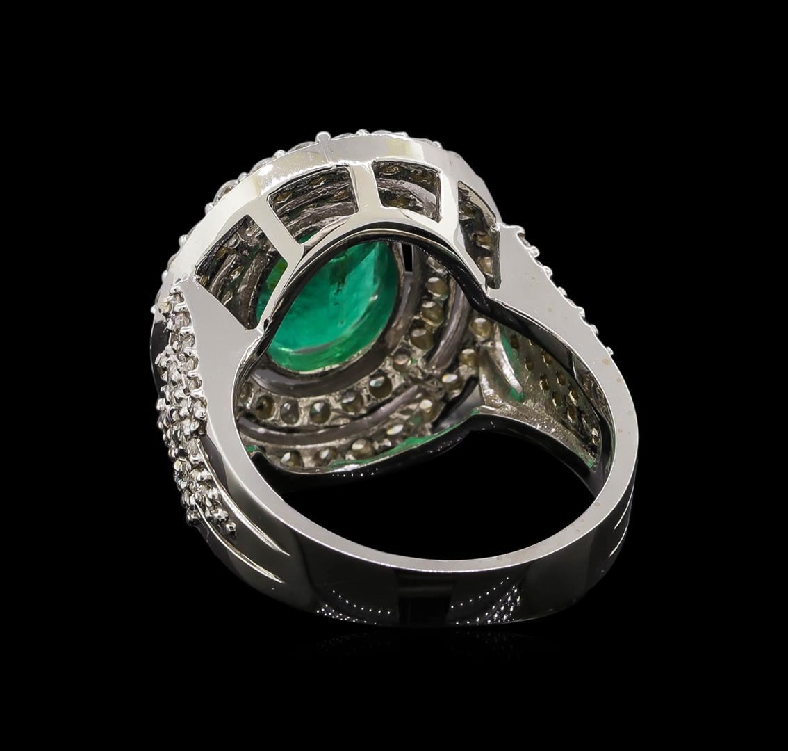 One electronically tested 14KT white gold ladies cast emerald and diamond ring with a bright polish finish. Identified with markings of "K14". Condition is new. Containing: One prong set oval modified brilliant cut natural emerald, measuring 11.47 x 9.17 x 5.96mm, approximate weight of 3.58ct., clarity is heavily included, type III, medium, very slightly grayish, green color, (GIA G 5/3), cut is good. One Hundred One prong set round brilliant cut diamonds, measuring 1.50 - 1.50 x 0.90mm (depth est.) approximate total weight of 101 Stones = 1.24ct. Clarity: SI-2 to I-1. Color: H - I, Cut is Good. Colored gemstones are presumed to have been subjected to commonly used enhancement processes. All diamonds and colored gemstones are graded in the mounting, unless otherwise stated. Total Weight of Colored Stones 3.58ct. Total Weight of Diamonds 1.24ct. Total Weight of Ring 10.10 grams. GGL Appraised.