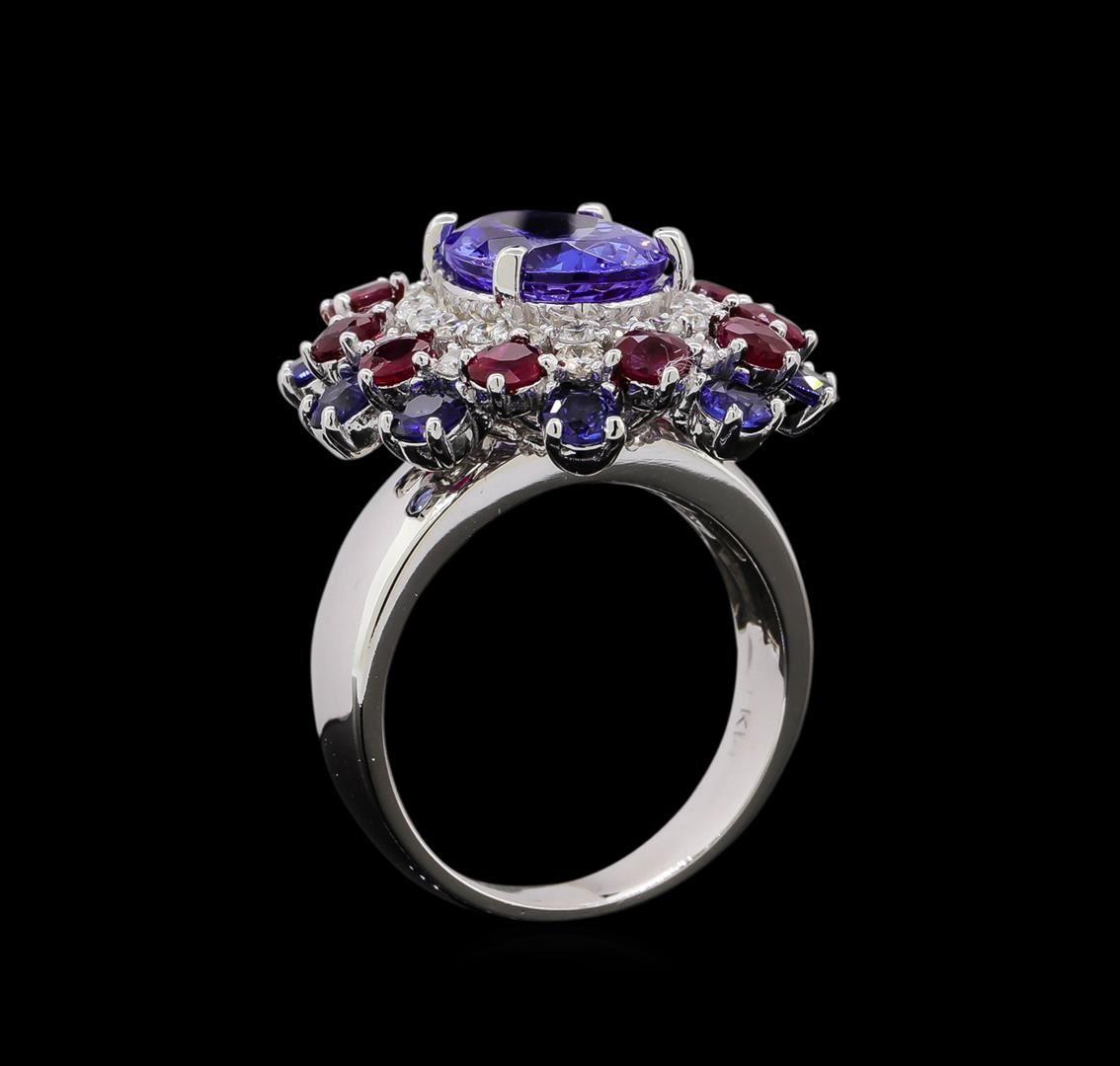 One electronically tested 14KT white gold ladies cast Tanzanite, Sapphire, Ruby and Diamond ring with a bright and brushed finish. Identified with markings of "K14". Condition is new. Containing: One prong set oval modified brilliant cut natural tanzanite, measuring 11.10 x 8.40 x 5.46mm, approximate weight of 3.58ct., clarity is eye clean, type I, medium light, very slightly grayish, violet color, (GIA V 4/3), cut is good. Ten prong set round modified brilliant cut natural blue sapphires, measuring 3.10 - 3.10 x 2.02 mm, approximate total weight of 1.60 ct., clarity is eye clean, type II, medium, moderately strong, blue color, (GIA B 5/4), cut is good. Ten prong set round modified brilliant cut natural rubies, measuring 3.10 - 3.10 x 2.02 mm, approximate total weight of 1.60 ct., clarity is moderately included, medium light, moderately strong, strongly purplish red color, (GIA stpR 4/4), cut is good. Thirty prong set round brilliant cut diamonds, measuring 2.00 - 1.80 x 1.14mm (depth est.) approximate total weight of 30 Stones = 0.75ct. Clarity: SI-1 to I-1. Color: J - K, Cut is Good. Colored gemstones are presumed to have been subjected to commonly used enhancement processes. All diamonds and colored gemstones are graded in the mounting, unless otherwise stated. Total Weight of Colored Stones 6.78ct. Total Weight of Diamonds 0.75ct. Total Weight of Ring 11.30 grams. GGL Appraised.
