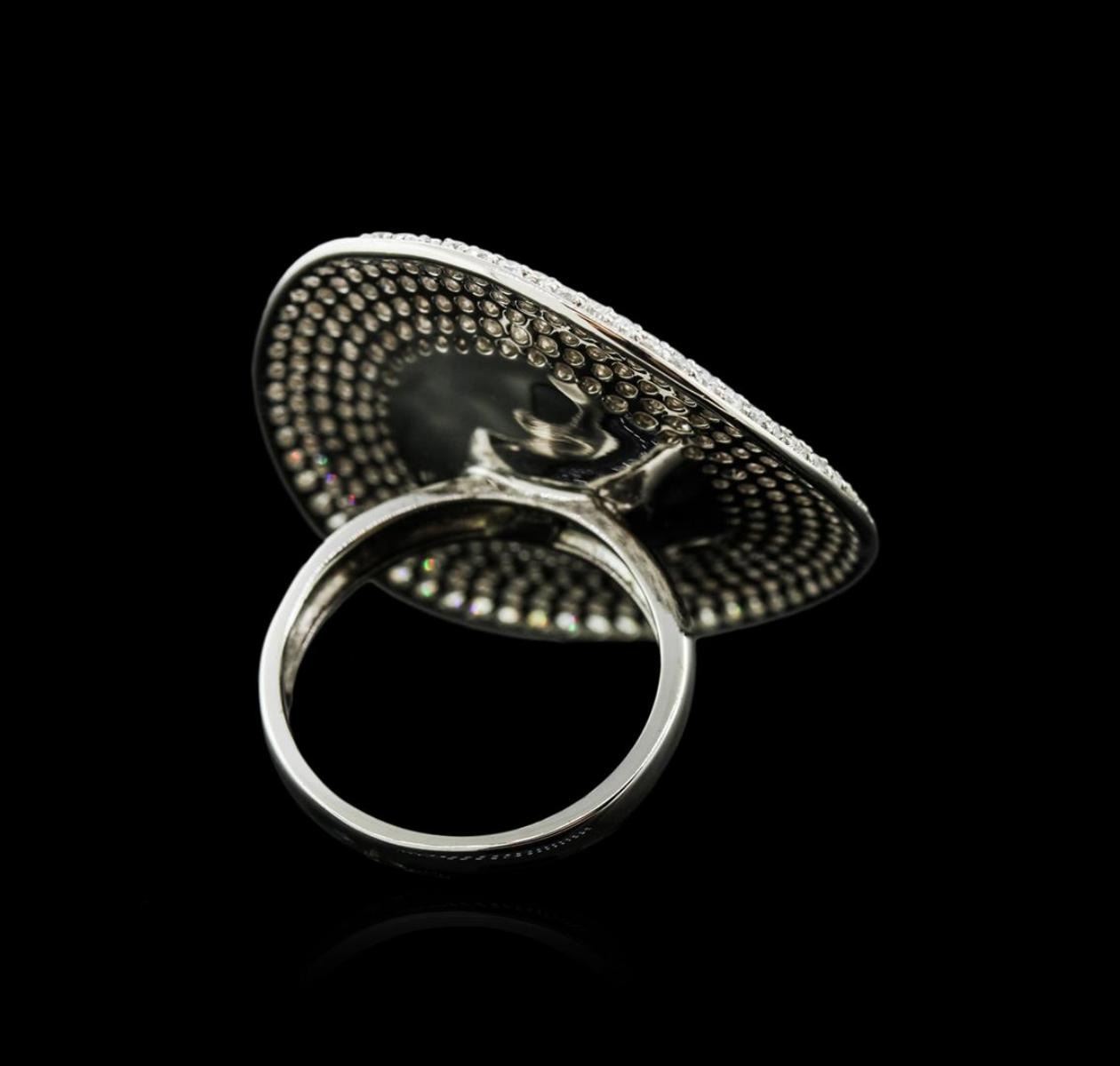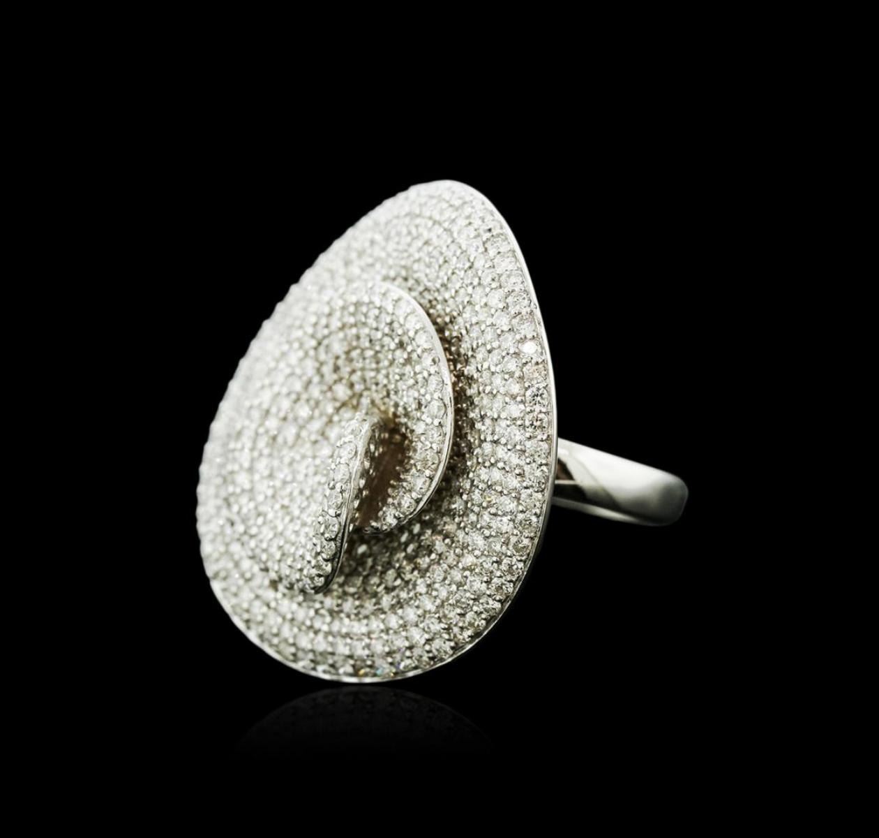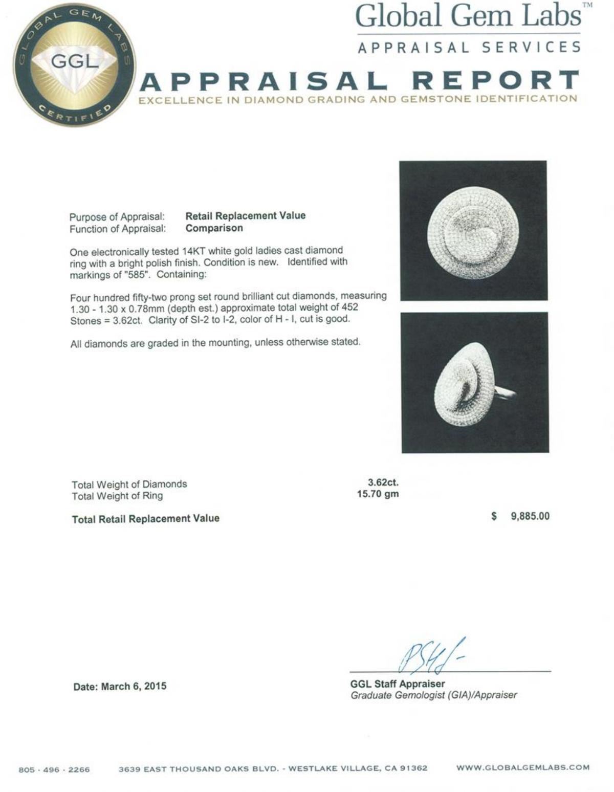 One electronically tested 14KT white gold ladies cast diamond ring with a bright polish finish. Identified with markings of "585". Condition is new. Containing: Four Hundred Fifty-Two prong set round brilliant cut diamonds, measuring 1.30 - 1.30 x 0.78mm (depth est.) approximate total weight of 452 Stones = 3.62ct.. Clarity: SI-2 to I-2. Color: H - I, Cut is Good. All diamonds are graded in the mounting, unless otherwise stated.. Total Weight of Diamonds 3.62ct.. Total Weight of Ring 15.70 grams. GGL Appraised at $9,885.00.