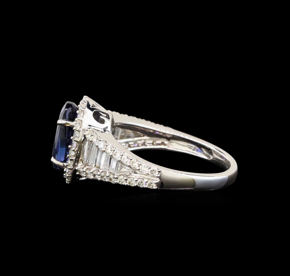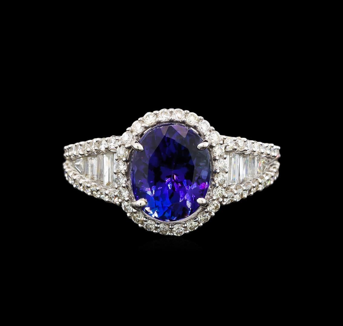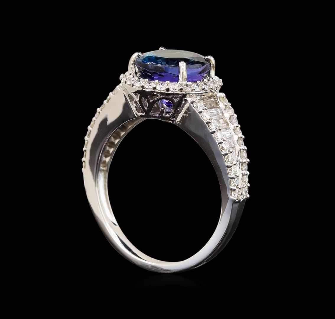 One electronically tested 14KT white gold ladies cast tanzanite and diamond ring with a flat shank with a bright polish finish. Trademark is Orianne. Identified with markings of "14K". Condition is new. Containing: One prong set oval modified brilliant cut natural tanzanite, measuring 9.70 x 8.70 x 6.20mm, approximate weight of 3.68ct., clarity is eye clean, type I, medium, moderately strong, bluish violet color, (GIA bV 5/4), cut is good. Sixty prong set round brilliant cut diamonds, measuring 1.30 - 1.30 x 0.78mm (depth est.) approximate total weight of 60 Stones = 0.48ct. Clarity: SI-2 to I-1. Color: I - J, Cut is Good. Twelve channel set baguette cut diamonds, measuring from 1.10 x 1.10 x 0.94mm (depth est.) to 3.00 x 1.50 x 1.28mm (depth est.) approximate total weight of 12 Stones = 0.32ct. Clarity: SI-1. Color: I - J. Colored gemstones are presumed to have been subjected to commonly used enhancement processes. All diamonds and colored gemstones are graded in the mounting, unless otherwise stated. Total Weight of Colored Stones 3.68ct. Total Weight of Diamonds 0.80ct. Total Weight of Ring 5.20 grams. GGL Appraised.