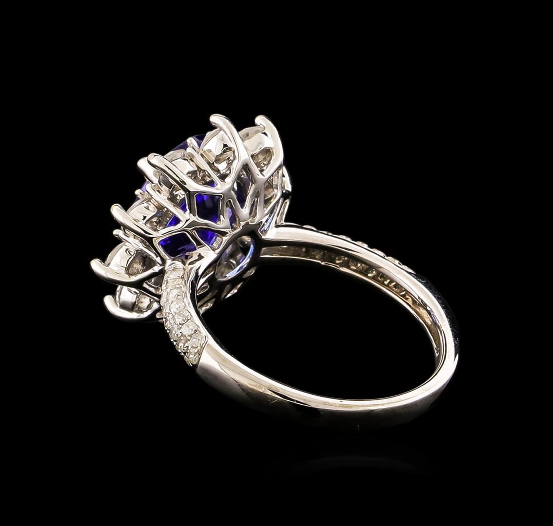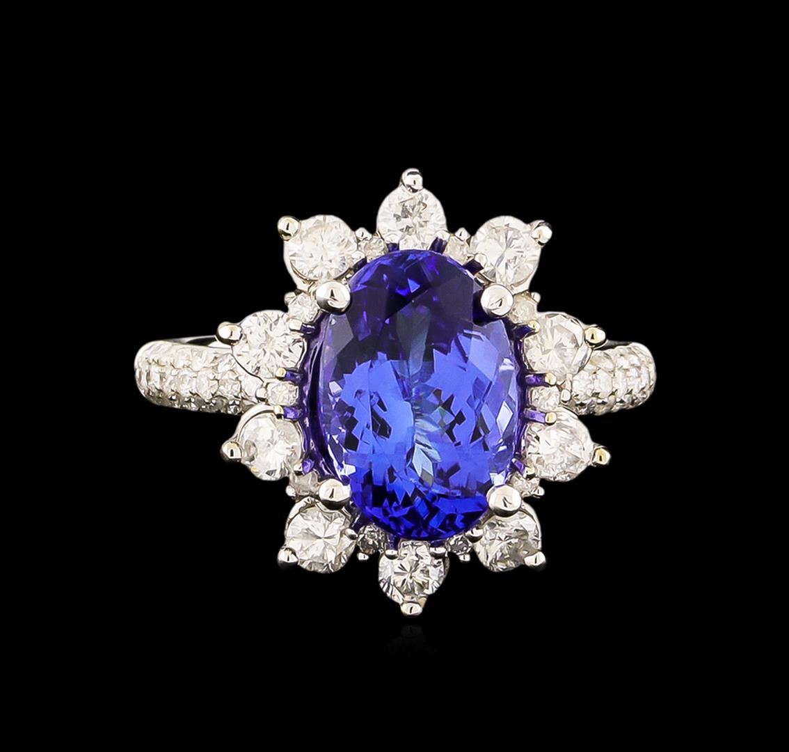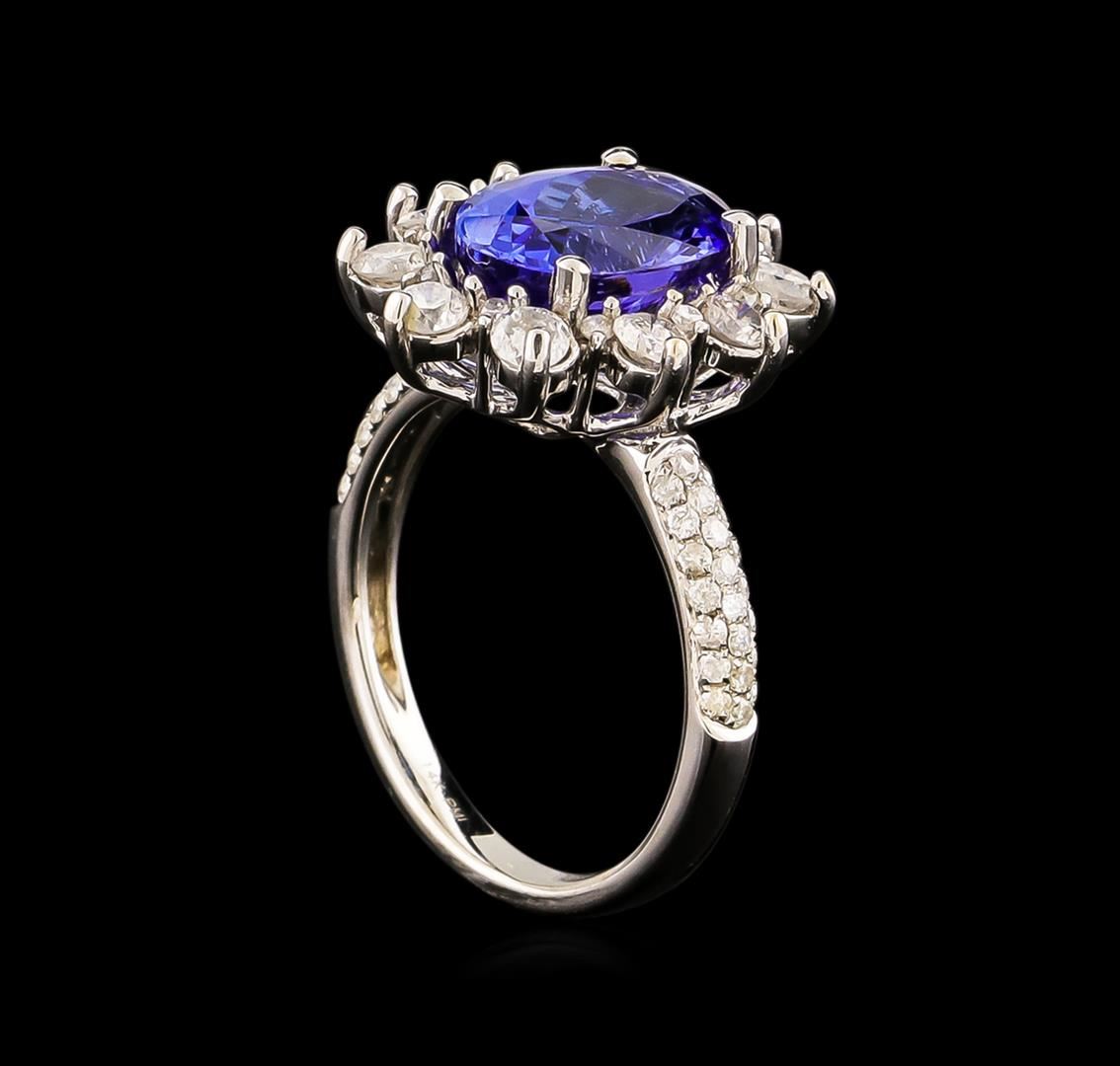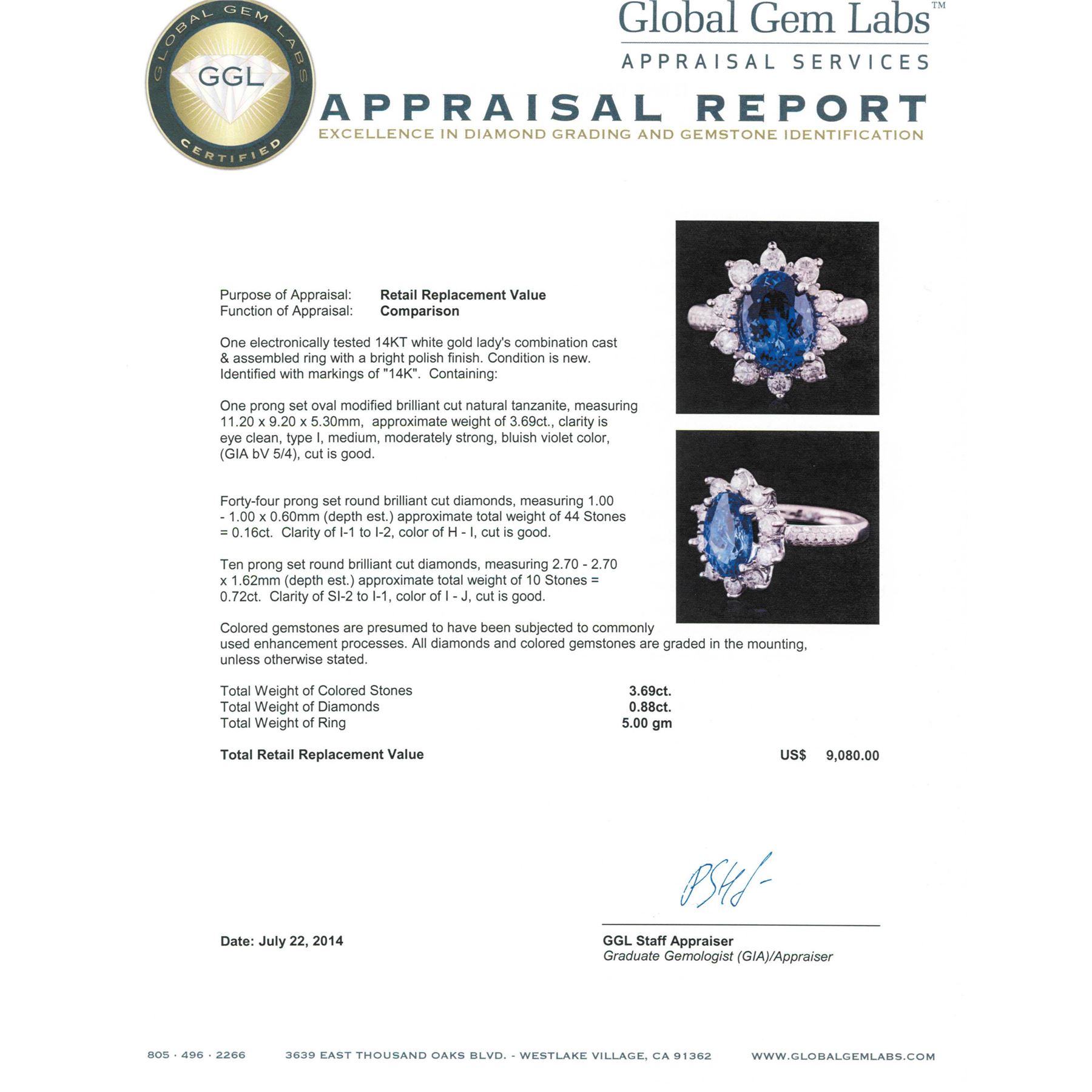 One electronically tested 14KT white gold ladies combination cast & assembled ring with a bright polish finish. Condition is new. Identified with markings of "14K". Containing: One prong set oval modified brilliant cut natural tanzanite, measuring 11.20 x 9.20 x 5.30mm, approximate weight of 3.69ct., clarity is eye clean, type I, medium, moderately strong, bluish violet color, (GIA bV 5/4), cut is good. Forty-Four prong set round brilliant cut diamonds, measuring 1.00 - 1.00 x 0.60mm (depth est.) approximate total weight of 44 Stones = 0.16ct. Clarity: I-1 to I-2. Color: H - I, Cut is Good. Ten prong set round brilliant cut diamonds, measuring 2.70 - 2.70 x 1.62mm (depth est.) approximate total weight of 10 Stones = 0.72ct. Clarity: SI-2 to I-1. Color: I - J, Cut is Good. Colored gemstones are presumed to have been subjected to commonly used enhancement processes. All diamonds and colored gemstones are graded in the mounting, unless otherwise stated. Total Weight of Colored Stones 3.69ct. Total Weight of Diamonds 0.88ct. Total Weight of Ring 5.00 grams. GGL Appraised.