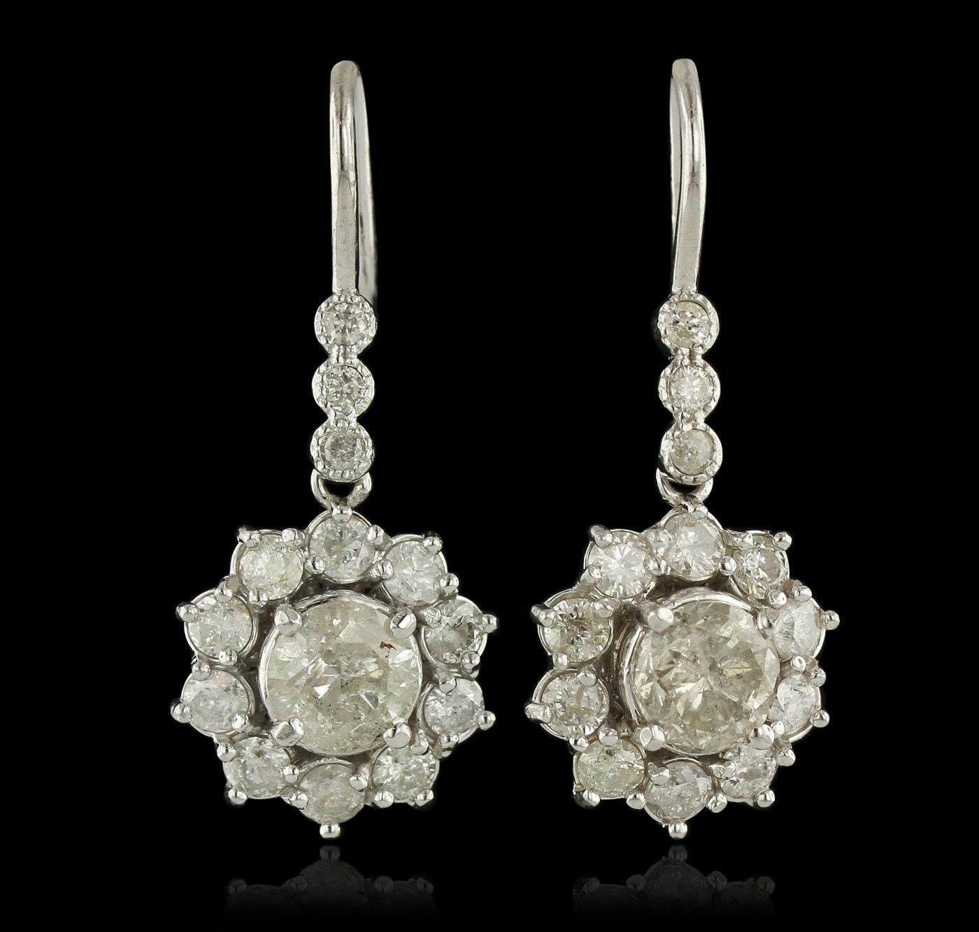 One pair electronically tested 14KT white gold ladies cast & assembled diamond earrings. Condition is new, good workmanship. Each earring features a diamond floret dangle, completed by a diamond set French hook. Bright polish finish with milgrain detailing. Identified with markings of "585". Containing: Two prong set round brilliant cut diamonds, measuring 6.00 - 5.95 x 4.00mm (depth est.), 5.00.%. GTCF approximate. Total Weight of 2 Stones = 1.92ct. Clarity grade is an average for the pair. Graded in the setting. Clarity I-2. Color: Faint Yellow and Very Light Brown. Twenty prong set round brilliant cut diamonds, measuring 2.80 - 2.70 x 1.65mm (depth est.) approximate. Total Weight of 20 Stones = 1.62ct. The color grade reflects the entire range of color for this group. Graded in the setting. Clarity: I-2 to I-3. Color: I - L Six bezel set round brilliant cut diamonds, measuring 1.80 - 1.70 x 1.05mm (depth est.) approximate. Total Weight of 6 Stones = 0.18ct. Graded in the setting. Clarity: I-1 to I-3. Color: I - K. Total Weight of Diamonds 3.72ct. Total Weight of Earrings 5.68 grams. AIG Appraised at $11,535.00.