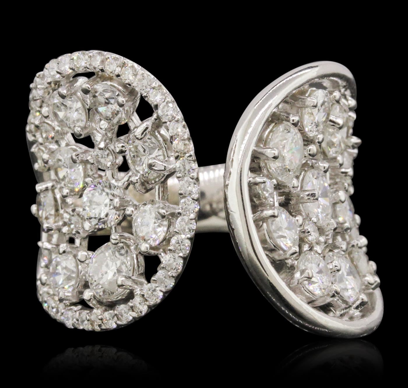 One electronically tested 14KT white gold ladies cast diamond ring with a bright polish finish. Condition is good. The ring features a stylized diamond set by-pass design, completed by a five millimeter wide band. Identified with markings of "14K". Containing: Five prong set round brilliant cut diamonds, measuring 4.10 - 4.00 x 2.43mm (depth est.) approximate. Total Weight of 5 Stones = 1.31ct. Graded in the setting. Clarity: SI-2 to I-1. Color: G - H Fifteen prong set round brilliant cut diamonds, measuring 3.30 - 3.00 x 1.89mm (depth est.) approximate. Total Weight of 15 Stones = 1.81ct. Graded in the setting. Clarity: SI-1 to I-1. Color: G - H Forty-Four prong set round brilliant cut diamonds, measuring 1.60 - 1.50 x 0.93mm (depth est.) approximate. Total Weight of 44 Stones = 0.69ct. Graded in the setting. Clarity: SI-1 to I-1. Color: G - H. Total Weight of Diamonds 3.81ct. Total Weight of Ring 10.28gm. AIG Appraised.
