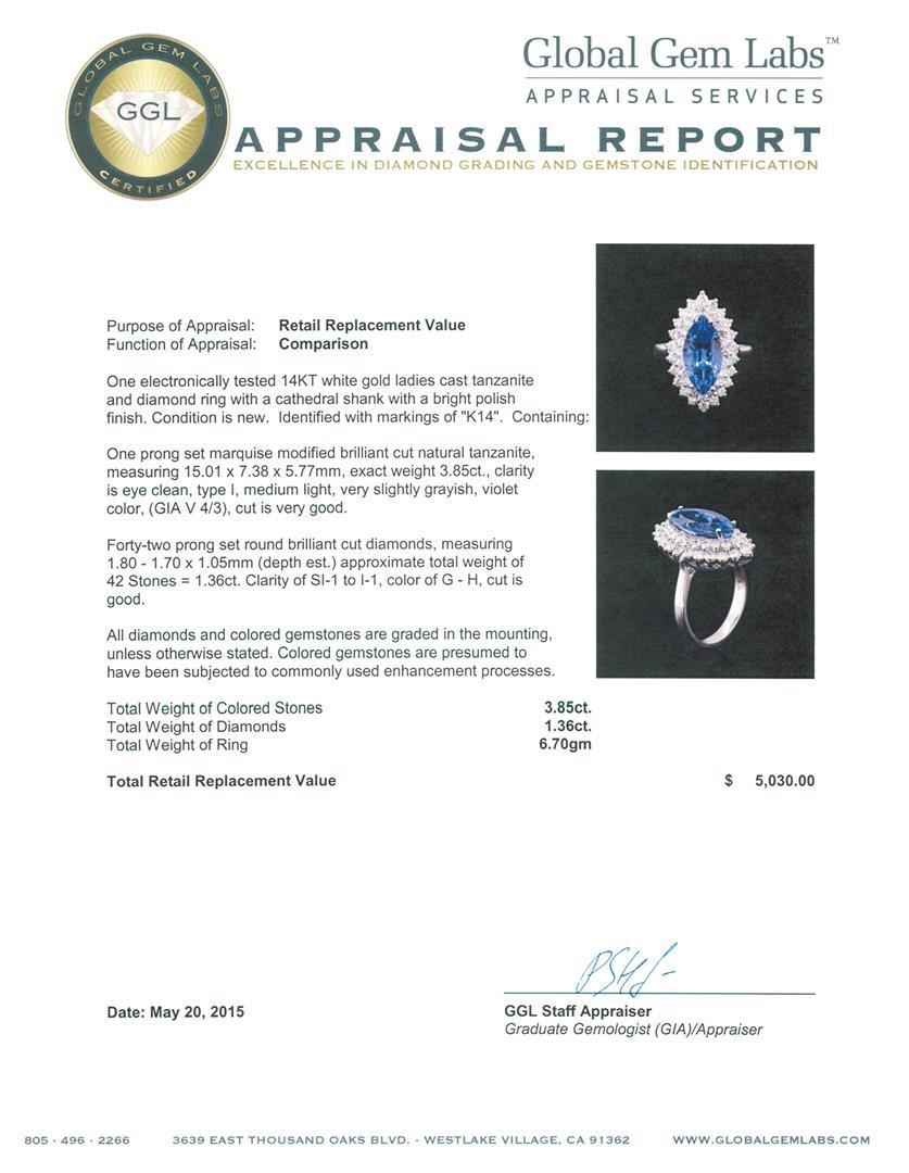 One electronically tested 14KT white gold ladies cast tanzanite and diamond ring with a cathedral shank with a bright polish finish. Identified with markings of "K14". Condition is new. Containing: One prong set marquise modified brilliant cut natural tanzanite, measuring 15.01 x 7.38 x 5.77mm, exact weight 3.85ct., clarity is eye clean, type I, medium light, very slightly grayish, violet color, (GIA V 4/3), cut is very good. Forty-Two prong set round brilliant cut diamonds, measuring 1.80 - 1.70 x 1.05mm (depth est.) approximate total weight of 42 Stones = 1.36ct. Clarity: SI-1 to I-1. Color: G - H, Cut is Good. All diamonds and colored gemstones are graded in the mounting, unless otherwise stated. Colored gemstones are presumed to have been subjected to commonly used enhancement processes. Total Weight of Colored Stones 3.85ct. Total Weight of Diamonds 1.36ct. Total Weight of Ring 6.70 grams. GGL Appraised.
