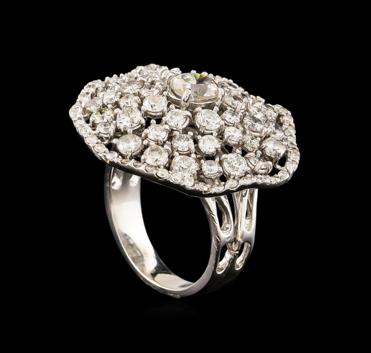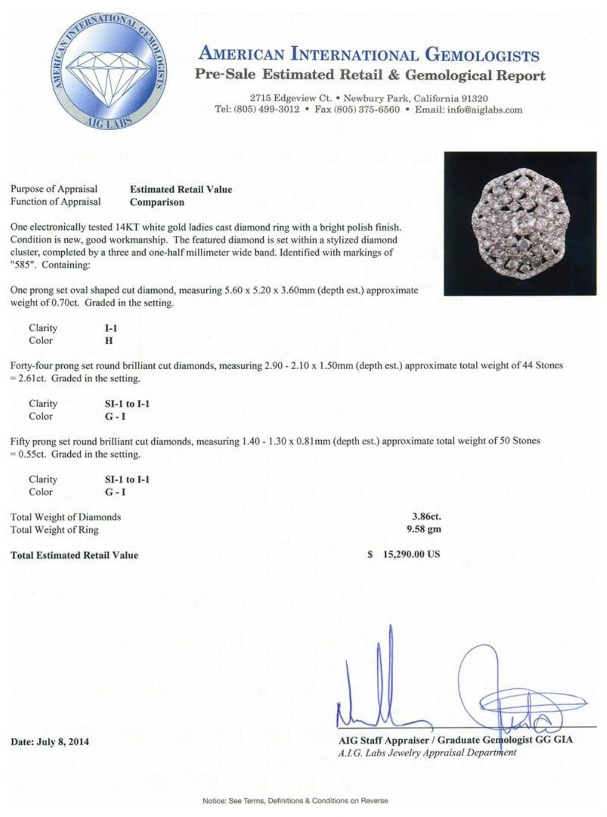 One electronically tested 14KT white gold ladies cast diamond ring with a bright polish finish. The featured diamond is set within a stylized diamond cluster, completed by a three and one-half millimeter wide band. Identified with markings of "585". Condition is new, good workmanship. Containing: One prong set oval shaped cut diamond, measuring 5.60 x 5.20 x 3.60mm (depth est.) approximate weight of 0.70ct. Graded in the setting. Clarity: I-1 . Color: H Forty-Four prong set round brilliant cut diamonds, measuring 2.90 - 2.10 x 1.50mm (depth est.) approximate total weight of 44 Stones = 2.61ct. Graded in the setting. Clarity: SI-1 to I-1 . Color: G - I Fifty prong set round brilliant cut diamonds, measuring 1.40 - 1.30 x 0.81mm (depth est.) approximate total weight of 50 Stones = 0.55ct. Graded in the setting. Clarity: SI-1 to I-1 . Color: G - I. Total Weight of Diamonds 3.86ct. Total Weight of Ring 9.58 grams. AIG Appraised.