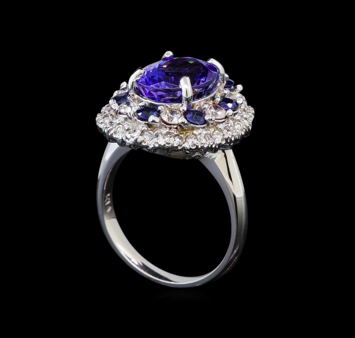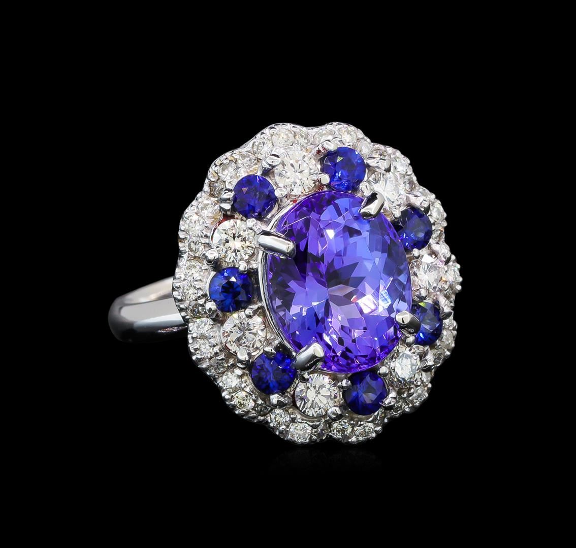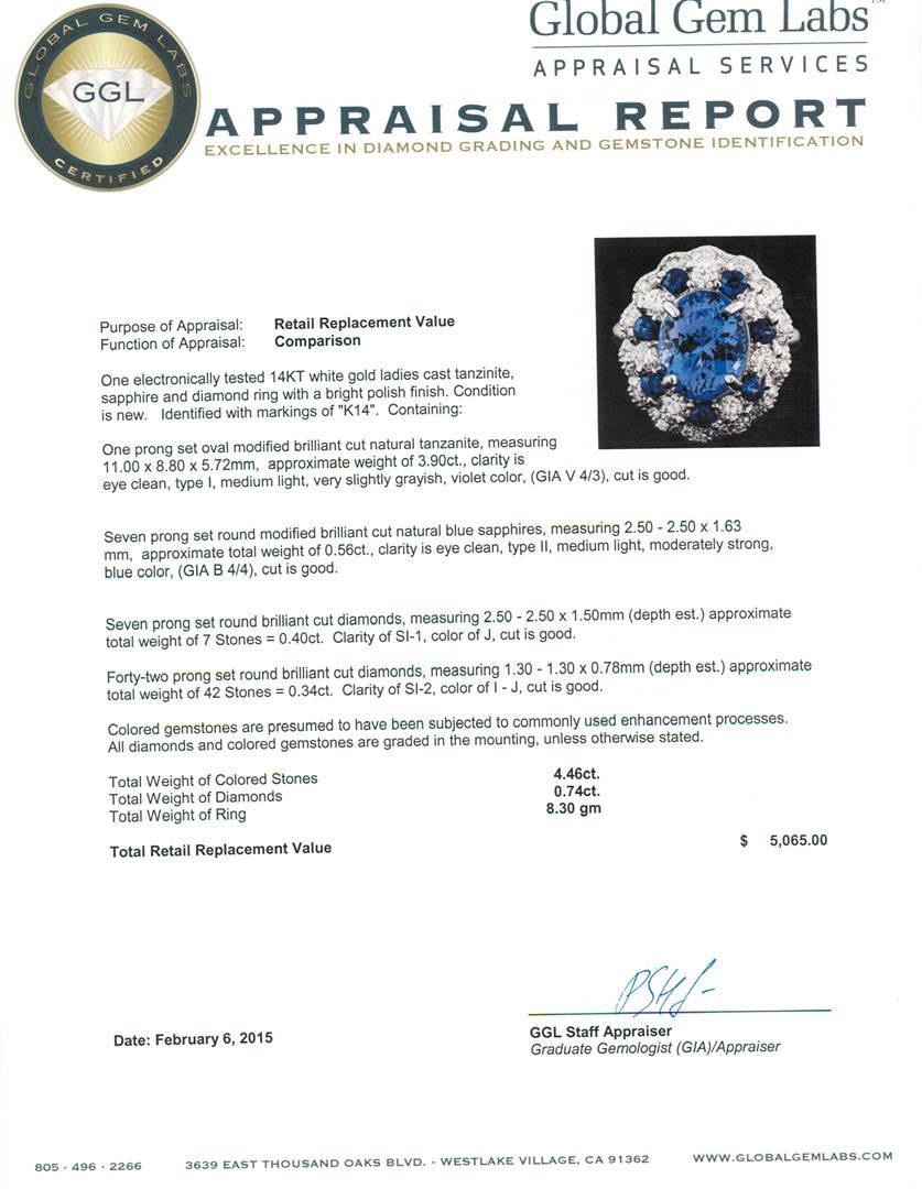 One electronically tested 14KT white gold ladies cast tanzanite, sapphire and diamond ring with a bright polish finish. Identified with markings of "K14". Condition is new. Containing: One prong set oval modified brilliant cut natural tanzanite, measuring 11.00 x 8.80 x 5.72mm, approximate weight of 3.90ct., clarity is eye clean, type I, medium light, very slightly grayish, violet color, (GIA V 4/3), cut is good. Seven prong set round modified brilliant cut natural blue sapphires, measuring 2.50 - 2.50 x 1.63 mm, approximate. Total Weight of 0.56ct., clarity is eye clean, type II, medium light, moderately strong, blue color, (GIA B 4/4), cut is good. Seven prong set round brilliant cut diamonds, measuring 2.50 - 2.50 x 1.50mm (depth est.) approximate. Total Weight of 7 Stones = 0.40ct. Clarity: SI-1. Color: J, Cut is Good. Forty-Two prong set round brilliant cut diamonds, measuring 1.30 - 1.30 x 0.78mm (depth est.) approximate. Total Weight of 42 Stones = 0.34ct. Clarity: SI-2. Color: I - J, Cut is Good. Colored gemstones are presumed to have been subjected to commonly used enhancement processes. All diamonds and colored gemstones are graded in the mounting, unless otherwise stated. Total Weight of Colored Stones 4.46ct. Total Weight of Diamonds 0.74ct. Total Weight of Ring 8.30 grams. GGL Appraised at $5,065.00.