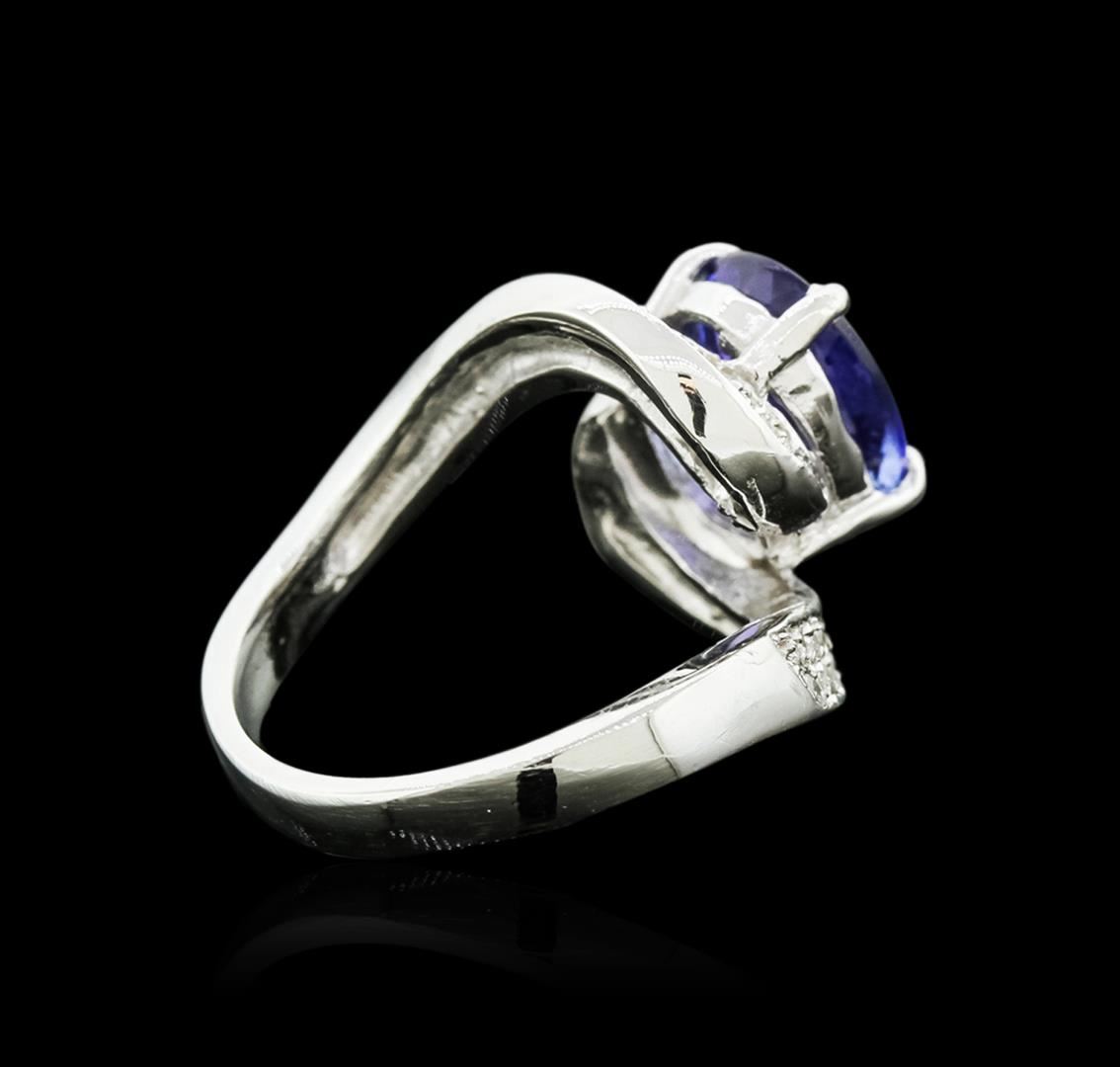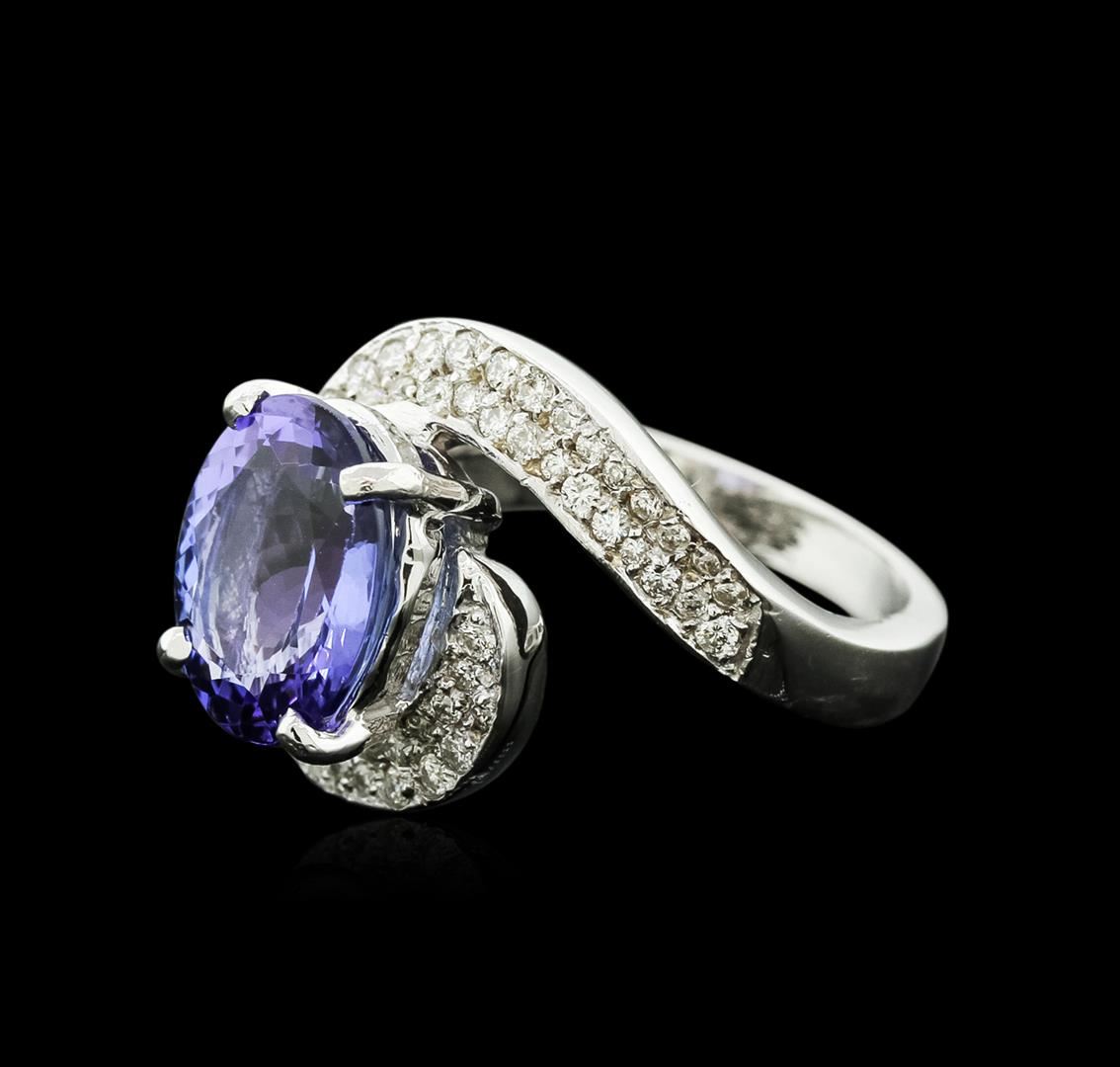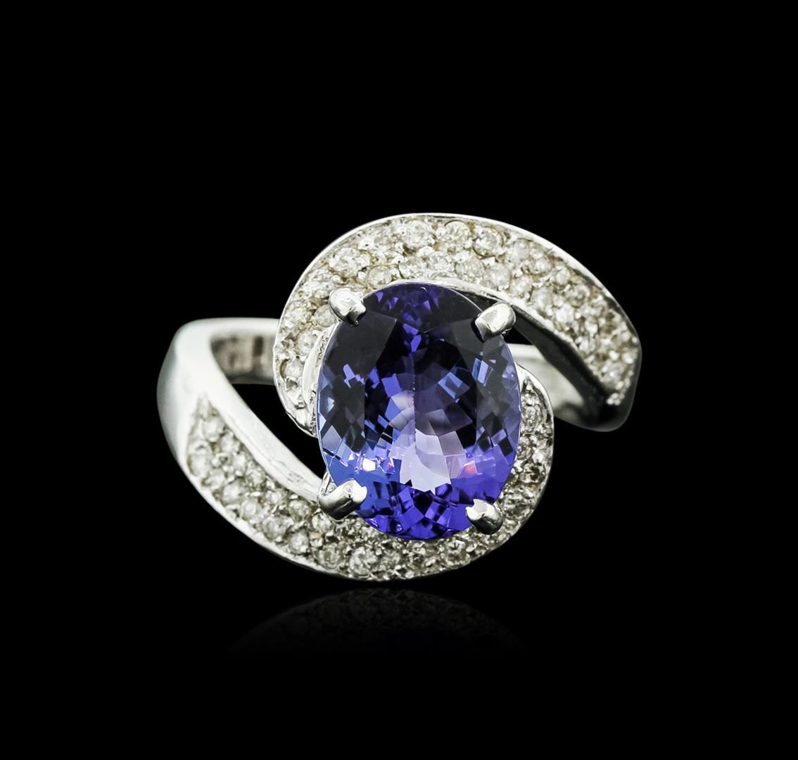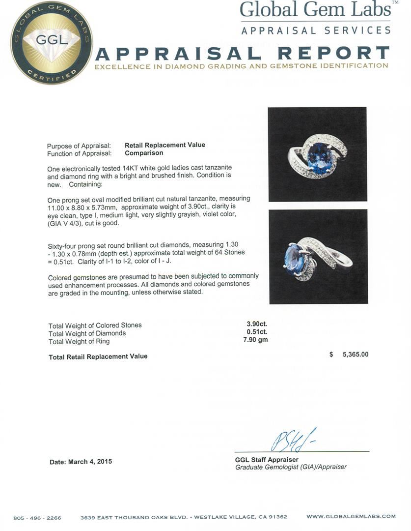 One electronically tested 14KT white gold ladies cast tanzanite and diamond ring with a bright and brushed finish. Condition is new. Containing: One prong set oval modified brilliant cut natural tanzanite, measuring 11.00. x 8.80 x 5.73mm, approximate weight of 3.90ct., clarity is eye clean, type I, medium light, very slightly grayish, violet color, (GIA V 4/3), cut is good. Sixty-Four prong set round brilliant cut diamonds, measuring 1.30 - 1.30 x 0.78mm (depth est.) approximate total weight of 64 Stones = 0.51ct. Clarity: I-1 to I-2. Color: I - J. Colored gemstones are presumed to have been subjected to commonly used enhancement processes. All diamonds and colored gemstones are graded in the mounting, unless otherwise stated. Total Weight of Colored Stones 3.90ct. Total Weight of Diamonds 0.51ct. Total Weight of Ring 7.90 grams. GGL Appraised at $5,365.00.