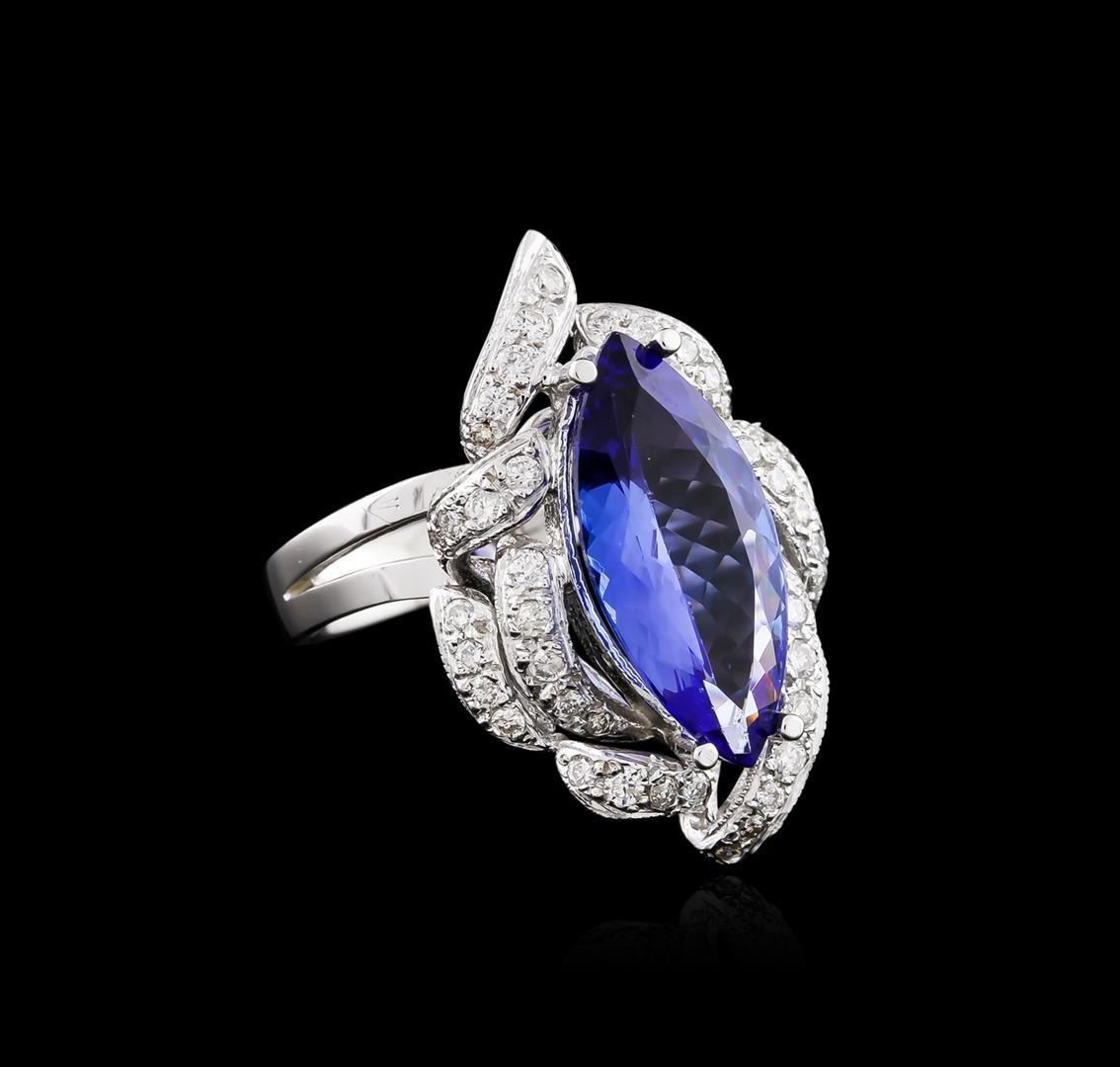 One electronically tested 14KT white gold ladies cast tanzanite and diamond ring with a split shoulder shank with a bright polish finish. Identified with markings of "K14". Condition is new. Containing: One prong set marquise modified brilliant cut natural tanzanite, measuring 16.95 x 7.90 x 4.60mm, approximate weight of 3.92ct., clarity is eye clean, type I, medium light, moderately strong, violet color, (GIA V 4/4), cut is good. Forty-Five prong set round brilliant cut diamonds, measuring 1.30 - 1.30 x 0.78mm (depth est.) approximate total weight of 45 Stones = 0.36ct. Clarity of SI-1 to I-1, Color of I - J, Cut is Good. All diamonds and colored gemstones are graded in the mounting, unless otherwise stated. Colored gemstones are presumed to have been subjected to commonly used enhancement processes. Total Weight of Colored Stones 3.92ct. Total Weight of Diamonds 0.36ct. Total Weight of Ring 7.00 grams. GGL Appraised.