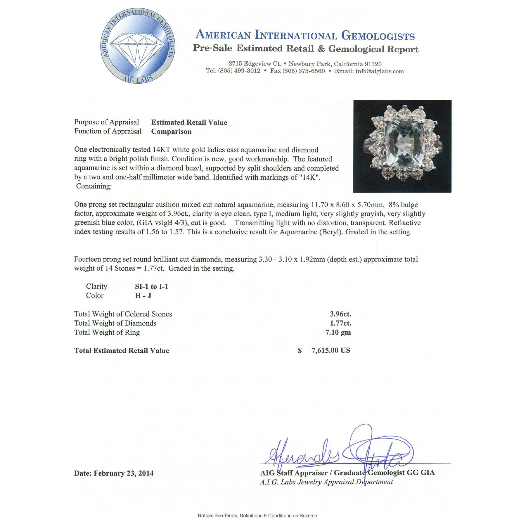 One electronically tested 14KT white gold ladies cast aquamarine and diamond ring with a bright polish finish. Condition is new, good workmanship. The featured aquamarine is set within a diamond bezel, supported by split shoulders and completed by a two and one-half millimeter wide band. Identified with markings of "14K". Containing: One prong set rectangular cushion mixed cut natural aquamarine, measuring 11.70 x 8.60 x 5.70mm, 8%. bulge factor, approximate weight of 3.96ct., clarity is eye clean, type I, medium light, very slightly grayish, very slightly greenish blue color, (GIA vslgB 4/3), cut is good. Transmitting light with no distortion, transparent. Refractive index testing results of 1.56 to 1.57. This is a conclusive result for Aquamarine (Beryl). Graded in the setting. Fourteen prong set round brilliant cut diamonds, measuring 3.30 - 3.10 x 1.92mm (depth est.) approximate. Total Weight of 14 Stones = 1.77ct. Graded in the setting. Clarity: SI-1 to I-1. Color: H - J. Total Weight of Colored Stones 3.96ct. Total Weight of Diamonds 1.77ct. Total Weight of Ring 7.10 grams. AIG Appraised.