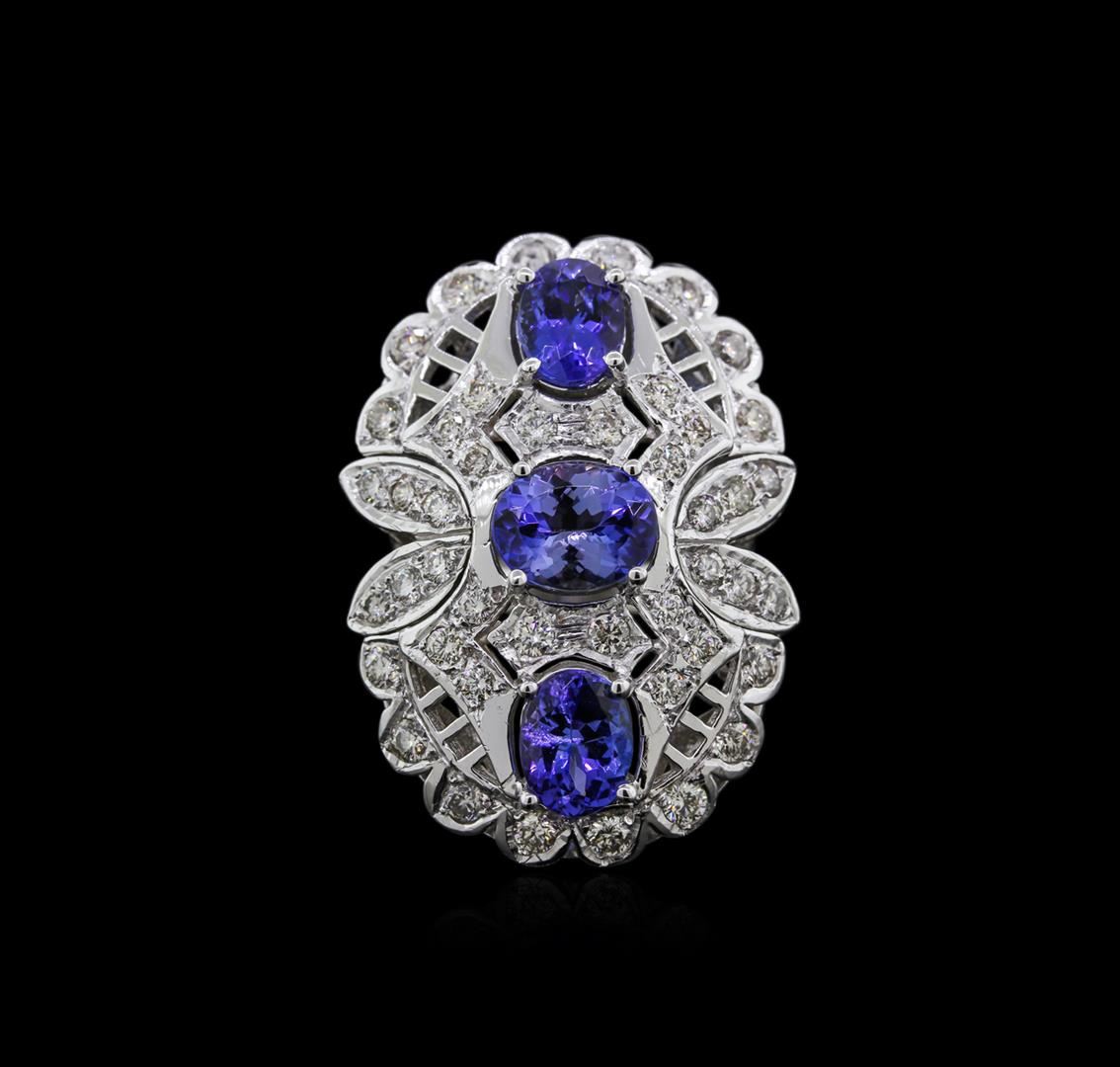One electronically tested 14KT white gold ladies cast tanzanite and diamond ring with a split shank with a bright polish finish. Identified with markings of "K14". Condition is new. Containing: Three prong set oval modified brilliant cut natural tanzanites, measuring 8.00 x 6.00 x 3.90mm, approximate total weight of 3.96ct., clarity is eye clean, type I, medium light, very slightly grayish, violet color, (GIA V 4/3), cut is good. Forty-Four prong set round brilliant cut diamonds, measuring 2.20 - 2.00 x 1.26mm (depth est.) approximate total weight of 44 Stones = 1.49ct. Clarity: SI-1 to SI-2. Color: I - J, Cut is Good. Diamonds and colored gemstones are graded in the mounting, unless otherwise stated. Colored gemstones are presumed to have been subjected to commonly used enhancement processes. Total Weight of Colored Stones 3.96ct. Total Weight of Diamonds 1.49ct. Total Weight of Ring 14.10 grams. GGL Appraised at $8,040.00.