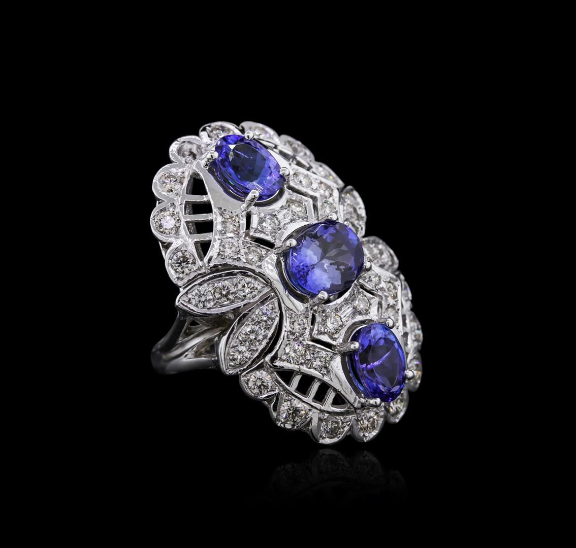 One electronically tested 14KT white gold ladies cast tanzanite and diamond ring with a split shank with a bright polish finish. Identified with markings of "K14". Condition is new. Containing: Three prong set oval modified brilliant cut natural tanzanites, measuring 8.00 x 6.00 x 3.90mm, approximate total weight of 3.96ct., clarity is eye clean, type I, medium light, very slightly grayish, violet color, (GIA V 4/3), cut is good. Forty-Four prong set round brilliant cut diamonds, measuring 2.20 - 2.00 x 1.26mm (depth est.) approximate total weight of 44 Stones = 1.49ct. Clarity: SI-1 to SI-2. Color: I - J, Cut is Good. Diamonds and colored gemstones are graded in the mounting, unless otherwise stated. Colored gemstones are presumed to have been subjected to commonly used enhancement processes. Total Weight of Colored Stones 3.96ct. Total Weight of Diamonds 1.49ct. Total Weight of Ring 14.10 grams. GGL Appraised at $8,040.00.