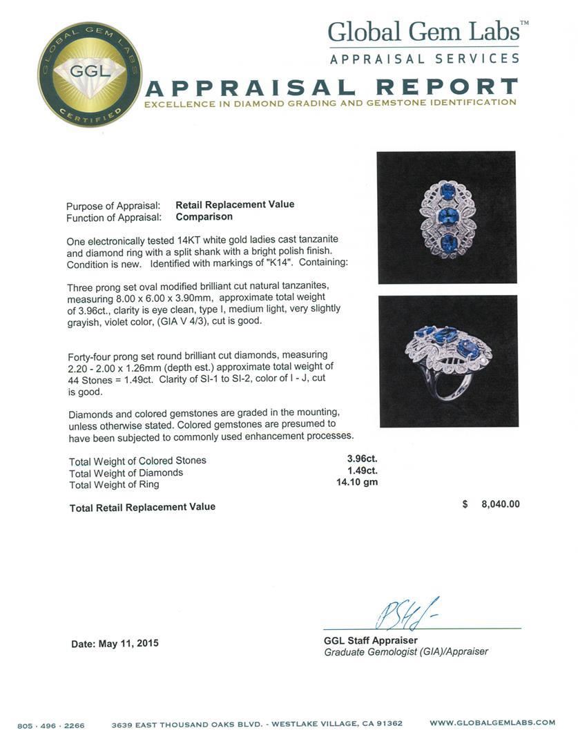 One electronically tested 14KT white gold ladies cast tanzanite and diamond ring with a split shank with a bright polish finish. Identified with markings of "K14". Condition is new. Containing: Three prong set oval modified brilliant cut natural tanzanites, measuring 8.00 x 6.00 x 3.90mm, approximate total weight of 3.96ct., clarity is eye clean, type I, medium light, very slightly grayish, violet color, (GIA V 4/3), cut is good. Forty-Four prong set round brilliant cut diamonds, measuring 2.20 - 2.00 x 1.26mm (depth est.) approximate total weight of 44 Stones = 1.49ct. Clarity: SI-1 to SI-2. Color: I - J, Cut is Good. Diamonds and colored gemstones are graded in the mounting, unless otherwise stated. Colored gemstones are presumed to have been subjected to commonly used enhancement processes. Total Weight of Colored Stones 3.96ct. Total Weight of Diamonds 1.49ct. Total Weight of Ring 14.10 grams.