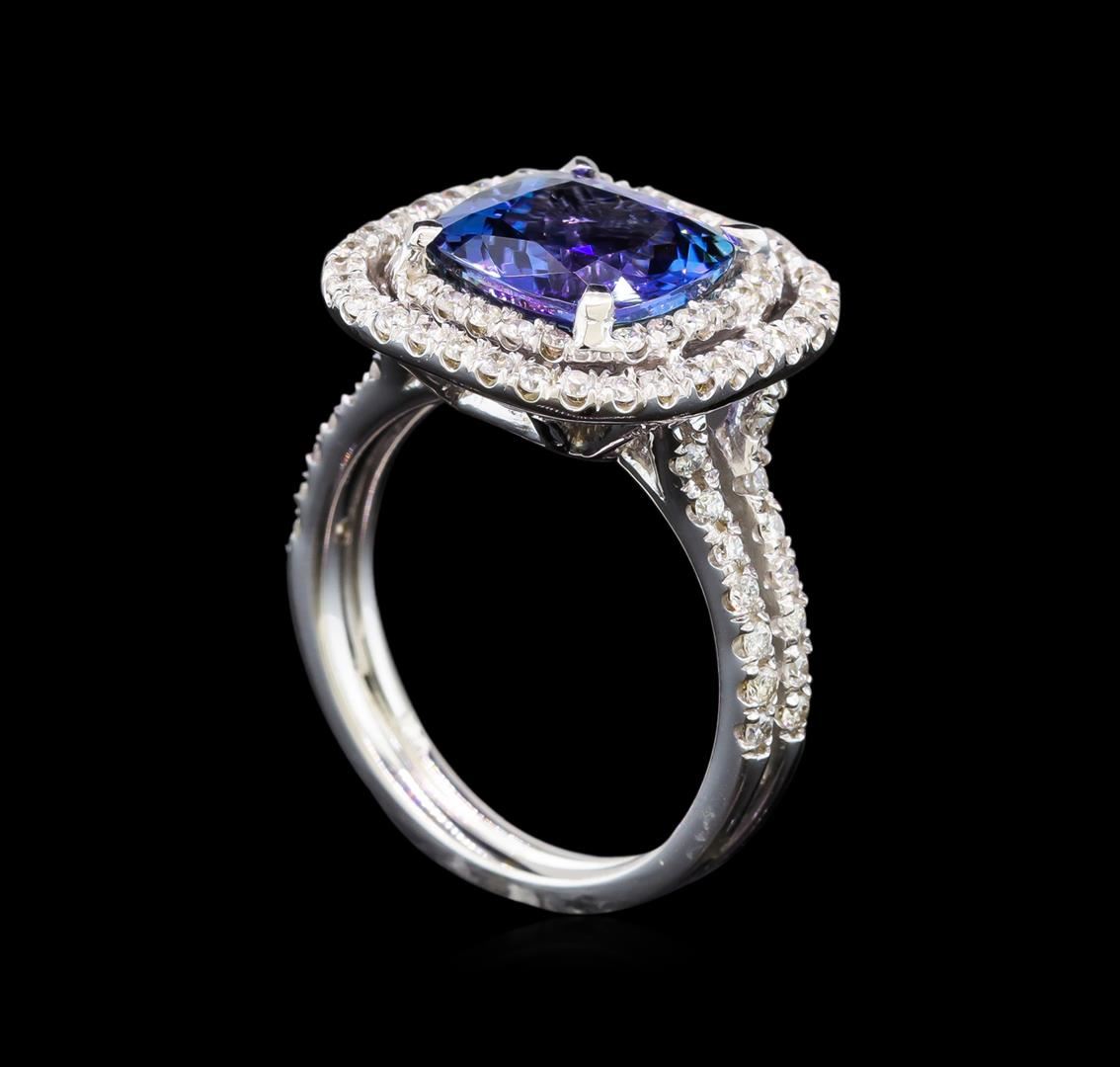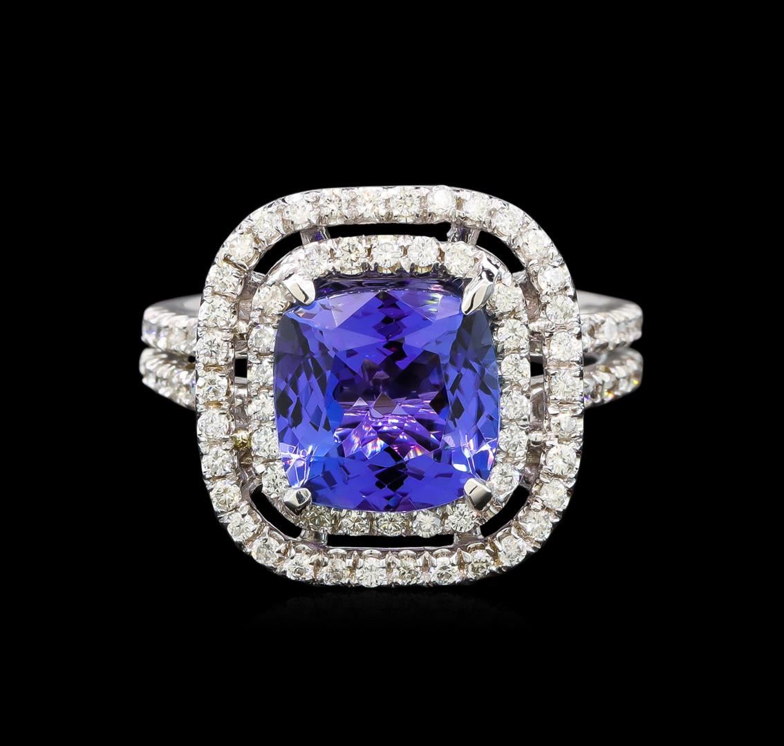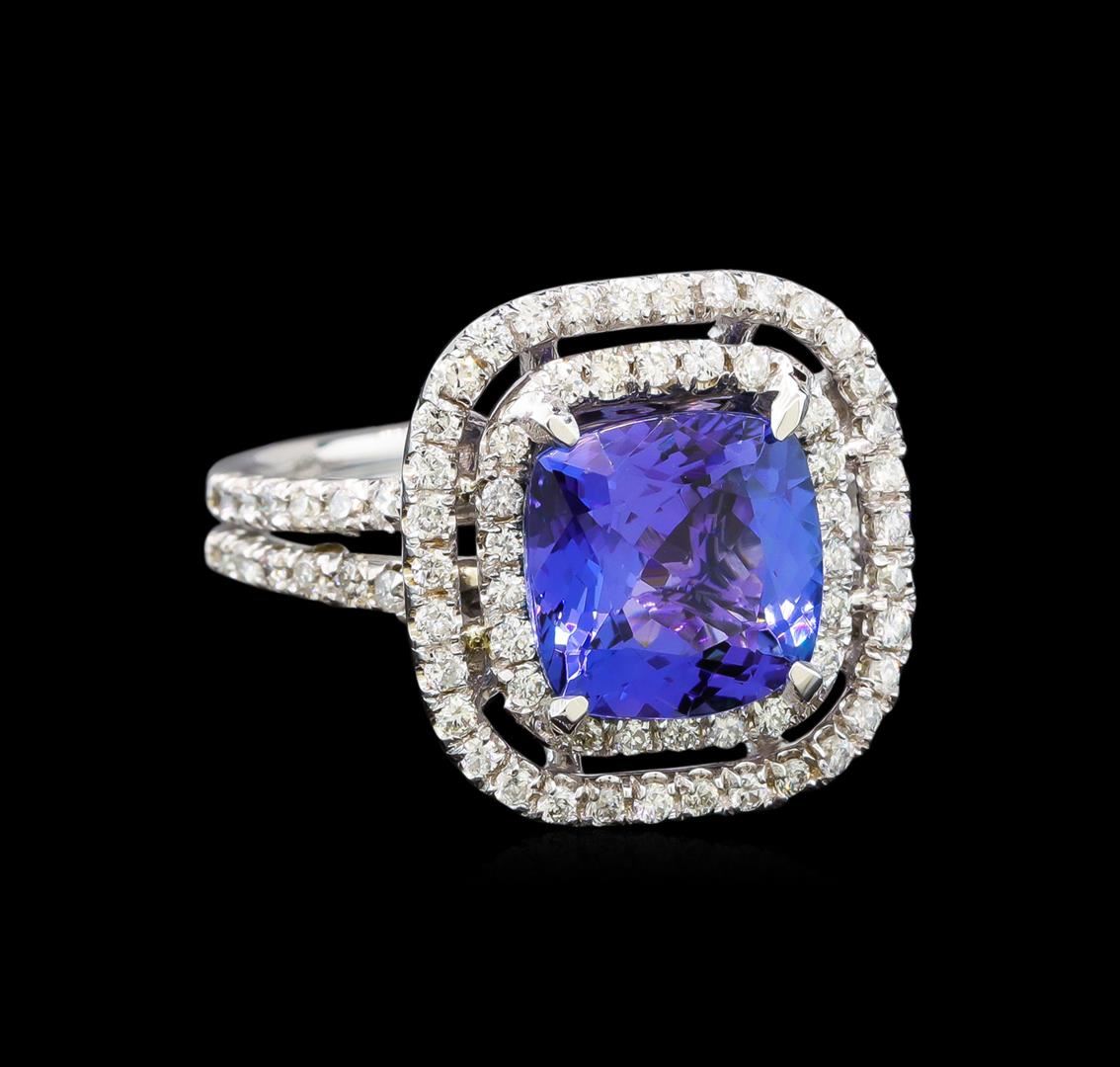 One electronically tested 14KT white gold ladies cast tanzanite and diamond ring with a bright polish finish. Identified with markings of "K14". Condition is new. Containing: One prong set square cushion modified brilliant cut natural tanzanite, measuring 9.20 x 9.20 x 5.98mm, approximate weight of 3.98ct., clarity is eye clean, type I, medium, moderately strong, violet color, (GIA V 5/4), cut is good. Eighty-Eight prong set round brilliant cut diamonds, measuring 1.30 - 1.30 x 0.78mm (depth est.) approximate total weight of 88 Stones = 0.70 ct. Clarity: SI-1 to SI-2. Color: H - I, Cut is Good. Colored gemstones are presumed to have been subjected to commonly used enhancement processes. All diamonds and colored gemstones are graded in the mounting, unless otherwise stated. Total Weight of Colored Stones 3.98ct. Total Weight of Diamonds 0.70 ct. Total Weight of Ring 6.20 grams. GGL Appraised.