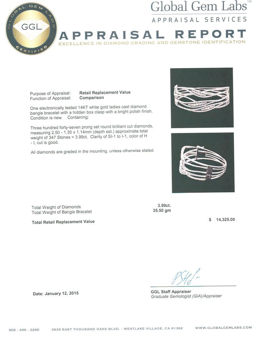 One electronically tested 14KT white gold ladies cast diamond bangle bracelet with a hidden box clasp with a bright polish finish. Condition is new. Containing: Three Hundred Forty-Seven prong set round brilliant cut diamonds, measuring 2.50 - 1.30 x 1.14mm (depth est.) approximate total weight of 347 Stones = 3.99ct. Clarity: SI-1 to I-1. Color: H - I, Cut is Good. All diamonds are graded in the mounting, unless otherwise stated. Total Weight of Diamonds 3.99ct. Total Weight of Bangle Bracelet 35.50 grams. GGL Appraised.
