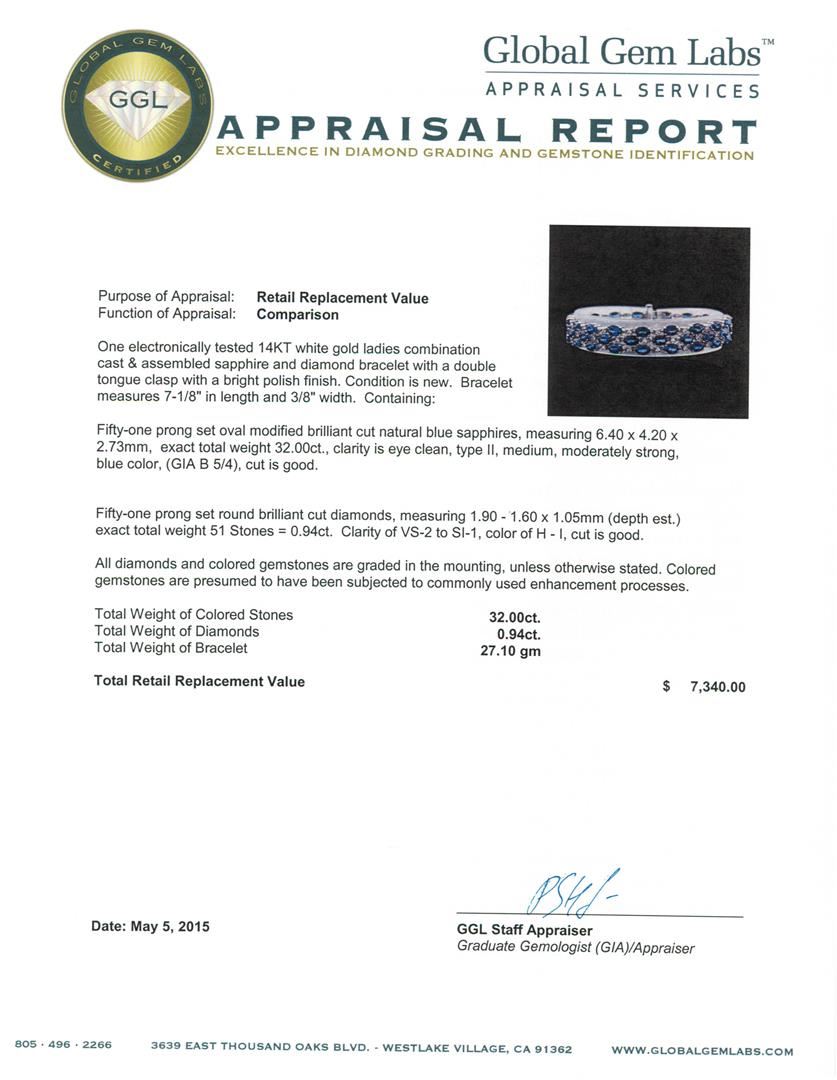One electronically tested 14KT white gold ladies combination cast & assembled sapphire and diamond bracelet with a double tongue clasp with a bright polish finish. Bracelet measures 7-1/8" in length and 3/8" width. Condition is new. Containing: Fifty-one prong set oval modified brilliant cut natural blue sapphires, measuring 6.40 x 4.20 x 2.73mm, exact total weight 32.00ct., clarity is eye clean, type II, medium, moderately strong, blue color, (GIA B 5/4), cut is good. Fifty-One prong set round brilliant cut diamonds, measuring 1.90 - 1.60 x 1.05mm (depth est.) exact total weight 51 Stones = 0.94ct. Clarity: VS-2 to SI-1. Color: H - I, Cut is Good. All diamonds and colored gemstones are graded in the mounting, unless otherwise stated. Colored gemstones are presumed to have been subjected to commonly used enhancement processes.. Total Weight of Colored Stones 32.00ct. Total Weight of Diamonds 0.94ct. Total Weight of Bracelet 27.10 grams. GGL Appraised.