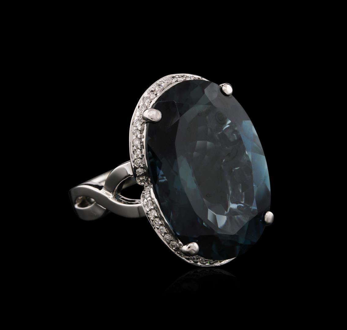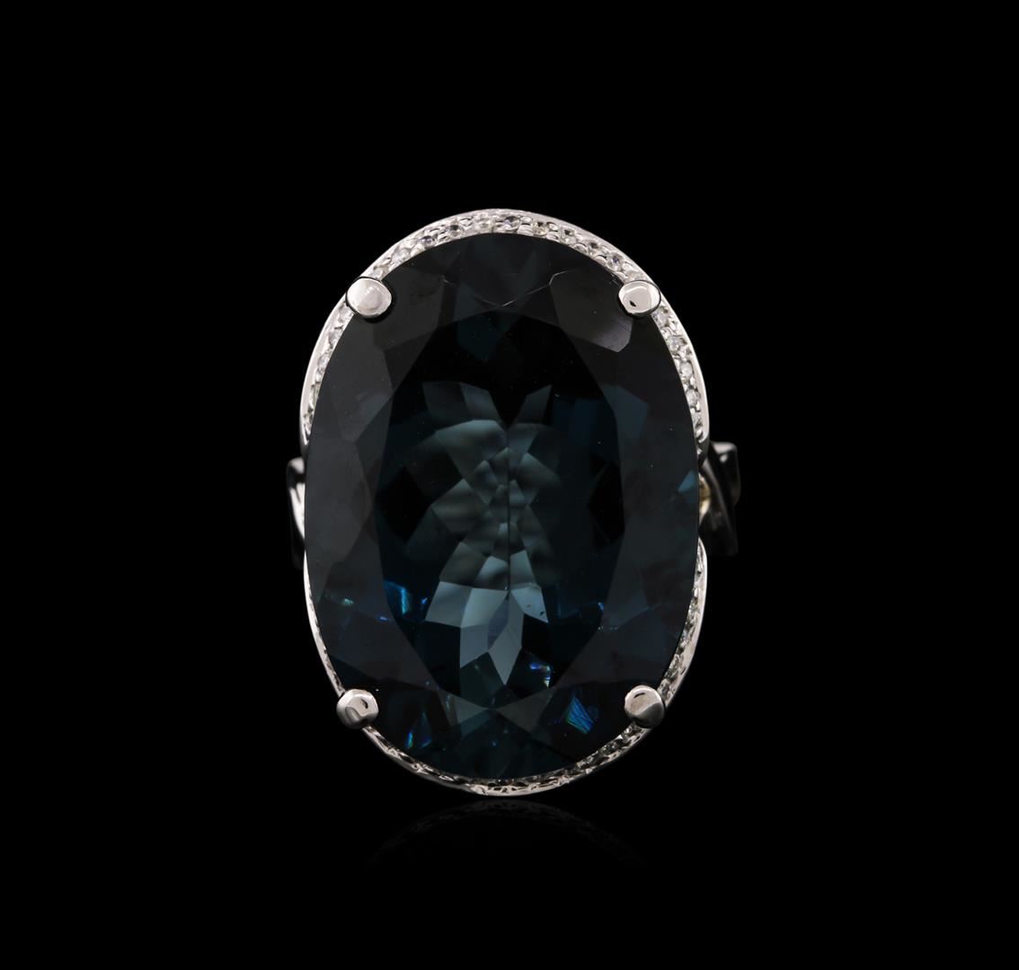 One electronically tested 14KT white gold ladies cast topaz and diamond ring with a bright polish finish. Identified with markings of "14K". Condition is new. Containing: One prong set oval modified brilliant cut natural blue topaz, measuring 24.75 x 18.00 x 11.70mm, approximate weight of 34.24ct., clarity is eye clean, type I, medium light, very slightly grayish, blue color, (GIA B 4/3), cut is good. Fifty prong set round brilliant cut diamonds, measuring 1.00 - 1.00 x 0.60mm (depth est.) approximate total weight of 50 Stones = 0.25ct. Clarity: SI-2 to I-1. Color: I - J, Cut is Good. Colored gemstones are presumed to have been subjected to commonly used enhancement processes. All diamonds and colored gemstones are graded in the mounting, unless otherwise stated. Total Weight of Colored Stones 34.24ct. Total Weight of Diamonds 0.25ct. Total Weight of Ring 15.70 grams. GGL Appraised at $2,695.00.