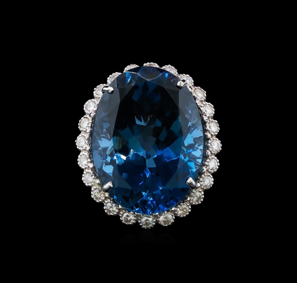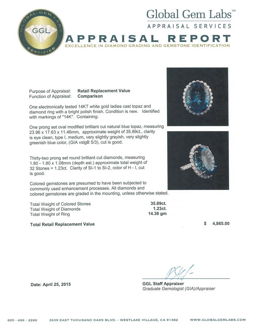 One electronically tested 14KT white gold ladies cast topaz and diamond ring with a bright polish finish. Identified with markings of "14K". Condition is new. Containing: One prong set oval modified brilliant cut natural blue topaz, measuring 23.96 x 17.63 x 11.46mm, approximate weight of 35.89ct., clarity is eye clean, type I, medium, very slightly grayish, very slightly greenish blue color, (GIA vslgB 5/3), cut is good. Thirty-Two prong set round brilliant cut diamonds, measuring 1.80 - 1.80 x 1.08mm (depth est.) approximate total weight of 32 Stones = 1.23ct. Clarity: SI-1 to SI-2. Color: H - I, Cut is Good. Colored gemstones are presumed to have been subjected to commonly used enhancement processes. All diamonds and colored gemstones are graded in the mounting, unless otherwise stated. Total Weight of Colored Stones 35.89ct. Total Weight of Diamonds 1.23ct. Total Weight of Ring 14.36 grams. GGL Appraised.