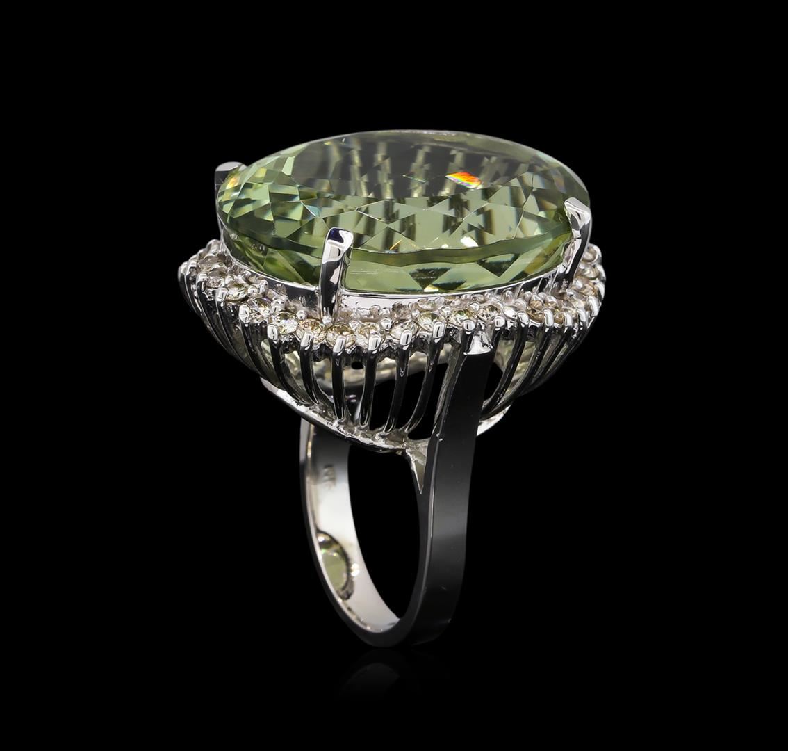 One electronically tested 14KT white gold ladies cast green quartz and diamond ring with a bright polish finish. Condition is new, good workmanship. The featured green quartz is set within a stylized diamond bezel, completed by a three millimeter wide band. Identified with markings of "K14". Containing: One prong set oval mixed cut natural green quartz, measuring 27.00 x 20.00 x 11.65mm, 10%. bulge factor, approximate weight of 37.65ct., clarity is eye clean, medium, very slightly grayish, slightly yellowish green color, (GIA slyG 5/3), cut is good. Transmitting light with no distortion, transparent. Graded in the setting. Thirty-Eight prong set round brilliant cut diamonds, measuring 2.20 - 2.00 x 1.26mm (depth est.) approximate. Total Weight of 38 Stones = 1.38ct. Graded in the setting. Clarity: SI-1 to I-1. Color: H - J. Total Weight of Colored Stones 37.65ct. Total Weight of Diamonds 1.38ct. Total Weight of Ring 20.61 grams. AIG Appraised.