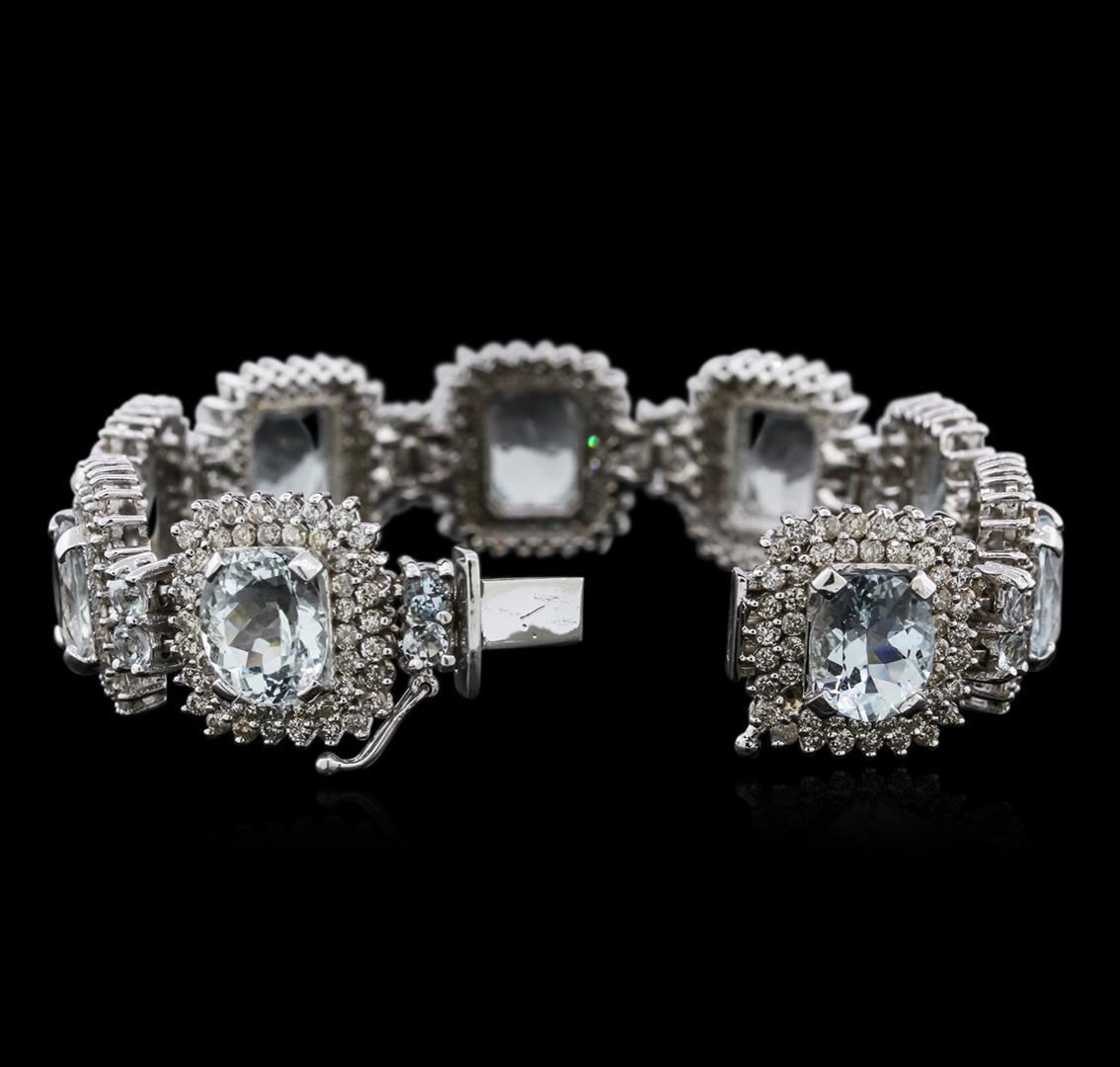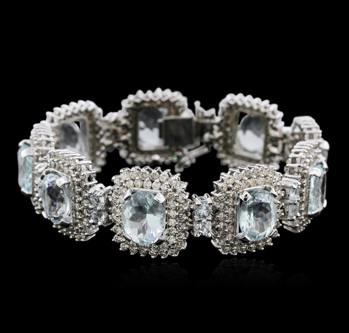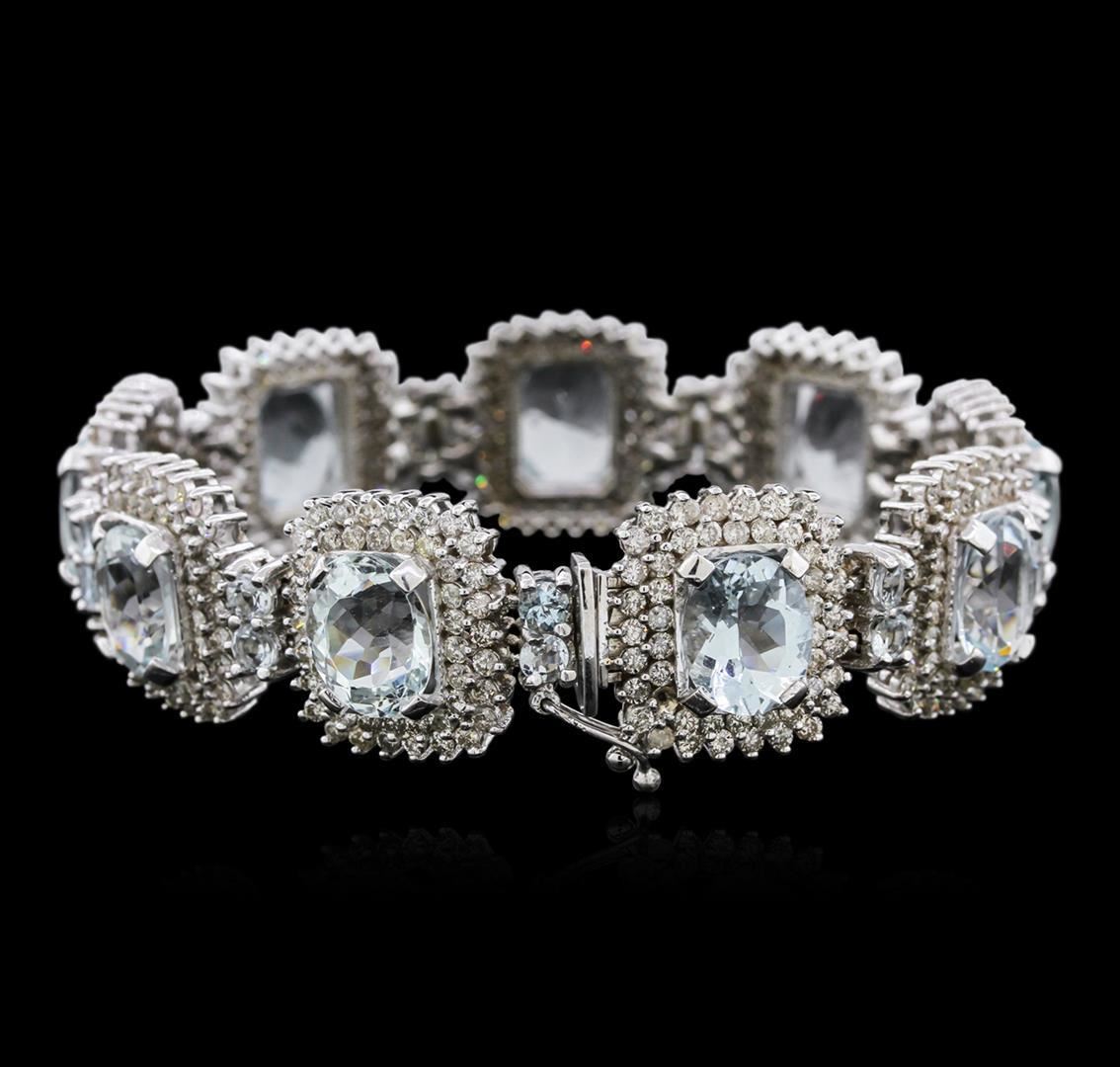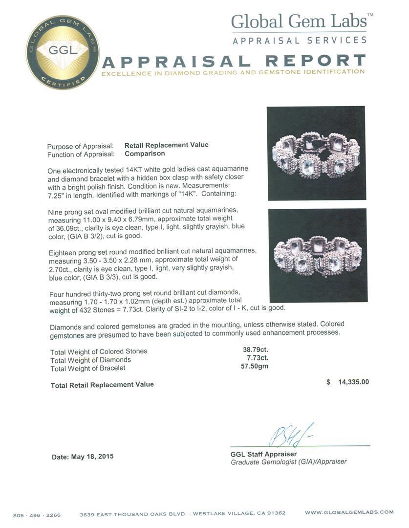 One electronically tested 14KT white gold ladies cast aquamarine and diamond bracelet with a hidden box clasp with safety closer with a bright polish finish. Measurements: 7.25" in length. Identified with markings of "14K". Condition is new. Containing: Nine prong set oval modified brilliant cut natural aquamarines, measuring 11.00 x 9.40 x 6.79mm, approximate total weight of 36.09ct., clarity is eye clean, type I, light, slightly grayish, blue color, (GIA B 3/2), cut is good. Eighteen prong set round modified brilliant cut natural aquamarines, measuring 3.50 - 3.50 x 2.28 mm, approximate total weight of 2.70ct., clarity is eye clean, type I, light, very slightly grayish, blue color, (GIA B 3/3), cut is good. Four Hundred Thirty-Two prong set round brilliant cut diamonds, measuring 1.70 - 1.70 x 1.02mm (depth est.) approximate total weight of 432 Stones = 7.73ct. Clarity: SI-2 to I-2. Color: I - K, Cut is Good. Diamonds and colored gemstones are graded in the mounting, unless otherwise stated. Colored gemstones are presumed to have been subjected to commonly used enhancement processes. Total Weight of Colored Stones 38.79ct. Total Weight of Diamonds 7.73ct. Total Weight of Bracelet 57.50 grams. GGL Appraised.