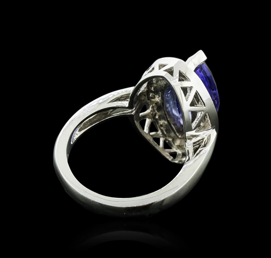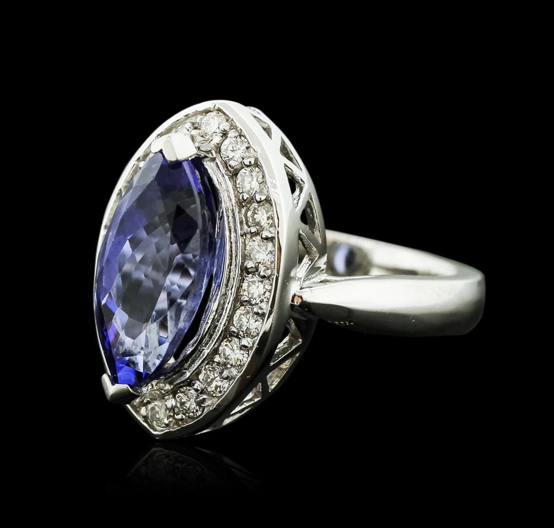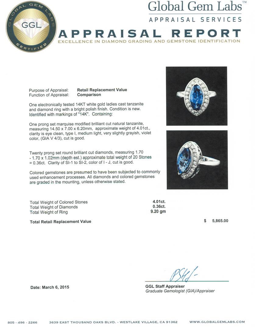 One electronically tested 14KT white gold ladies cast tanzanite and diamond ring with a bright polish finish. Identified with markings of "14K". Condition is new. Containing: One prong set marquise modified brilliant cut natural tanzanite, measuring 14.50 x 7.00 x 6.20mm, approximate weight of 4.01ct., clarity is eye clean, type I, medium light, very slightly grayish, violet color, (GIA V 4/3), cut is good. Twenty prong set round brilliant cut diamonds, measuring 1.70 - 1.70 x 1.02mm (depth est.) approximate total weight of 20 Stones = 0.36ct.. Clarity: SI-1 to SI-2. Color: I - J, Cut is Good. Colored gemstones are presumed to have been subjected to commonly used enhancement processes. All diamonds and colored gemstones are graded in the mounting, unless otherwise stated.. Total Weight of Colored Stones 4.01ct.. Total Weight of Diamonds 0.36ct.. Total Weight of Ring 9.20 grams. GGL Appraised.