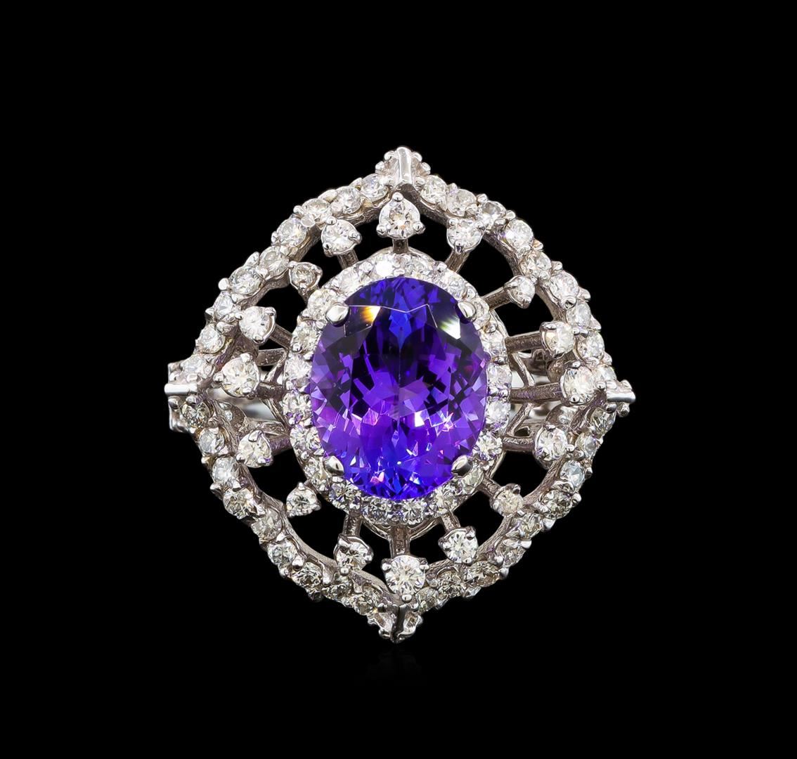 One electronically tested 14KT white gold ladies cast tanzanite and diamond ring with a bright polish finish. Identified with markings of "K14". Condition is new. Containing: One prong set oval modified brilliant cut natural tanzanite, measuring 10.50 x 8.30 x 6.59mm, approximate weight of 4.04ct., clarity is eye clean, type I, medium light, very slightly grayish, violet color, (GIA V 4/3), cut is good. Ninety-Two prong set round brilliant cut diamonds, measuring 1.60 - 1.20 x 0.84mm (depth est.) approximate total weight of 92 Stones = 0.50ct. Clarity: SI-1 to I-1. Color: G - H, Cut is Good. Colored gemstones are presumed to have been subjected to commonly used enhancement processes. All diamonds and colored gemstones are graded in the mounting, unless otherwise stated. Total Weight of Colored Stones 4.04ct. Total Weight of Diamonds 0.50ct. Total Weight of Ring 6.60 grams. GGL Appraised.