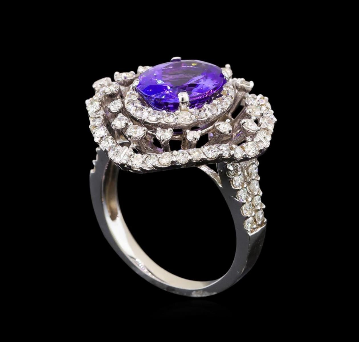 One electronically tested 14KT white gold ladies cast tanzanite and diamond ring with a bright polish finish. Identified with markings of "K14". Condition is new. Containing: One prong set oval modified brilliant cut natural tanzanite, measuring 10.50 x 8.30 x 6.59mm, approximate weight of 4.04ct., clarity is eye clean, type I, medium light, very slightly grayish, violet color, (GIA V 4/3), cut is good. Ninety-Two prong set round brilliant cut diamonds, measuring 1.60 - 1.20 x 0.84mm (depth est.) approximate total weight of 92 Stones = 0.50 ct. Clarity: SI-1 to I-1. Color: G - H, Cut is Good. Colored gemstones are presumed to have been subjected to commonly used enhancement processes. All diamonds and colored gemstones are graded in the mounting, unless otherwise stated. Total Weight of Colored Stones 4.04ct. Total Weight of Diamonds 0.50 ct. Total Weight of Ring 6.60 grams. GGL Appraised.