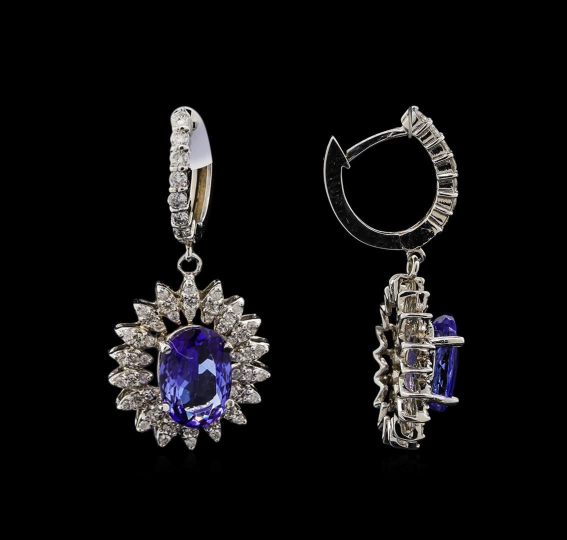 One pair electronically tested 14KT white gold ladies cast tanzanite and diamond earrings with hinged clip backs with a bright polish finish. Identified with markings of "14K". Condition is new. Containing: Two prong set oval modified brilliant cut natural tanzanites, measuring 10.47 x 7.35 x 3.77mm, approximate total weight of 4.08ct., clarity is eye clean, type I, medium light, very slightly grayish, violet color, (GIA V 4/3), cut is good. One Hundred Twenty-Two prong set round brilliant cut diamonds, measuring 1.40 - 1.30 x 0.81mm (depth est.) approximate total weight of 122 Stones = 1.10ct. Clarity: SI-2 to I-1. Color: H - I, Cut is Good. Colored gemstones are presumed to have been subjected to commonly used enhancement processes. All diamonds and colored gemstones are graded in the mounting, unless otherwise stated. Total Weight of Colored Stones 4.08ct. Total Weight of Diamonds 1.10ct. Total Weight of Earrings 8.10 grams. GGL Appraised at $6,505.00.
