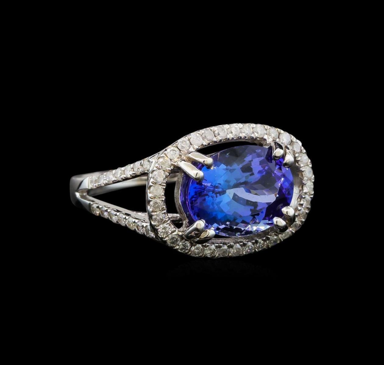 One electronically tested 14KT white gold ladies cast tanzanite and diamond ring with a split shank with a bright polish finish. Trademark is Orianne. Identified with markings of "K14". Condition is new. Containing: One prong set oval modified brilliant cut natural tanzanite, measuring 11.33 x 8.45 x 6.14mm, approximate weight of 4.14ct., clarity is eye clean, type I, medium light, very slightly grayish, violet color, (GIA V 4/3), cut is good. Sixty-One prong set round brilliant cut diamonds, measuring 1.20 - 1.20 x 0.72mm (depth est.) approximate total weight of 61 Stones = 0.38ct. Clarity: I-1 to I-2. Color: I - J. All diamonds and colored gemstones are graded in the mounting, unless otherwise stated. Colored gemstones are presumed to have been subjected to commonly used enhancement processes. Total Weight of Colored Stones 4.14ct. Total Weight of Diamonds 0.38ct. Total Weight of Ring 5.20 grams. GGL Appraised.