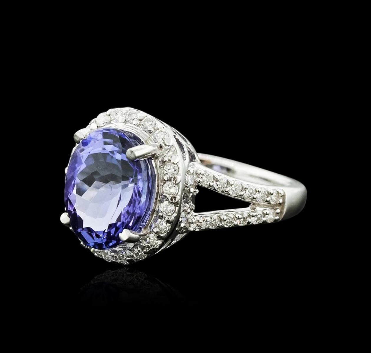 One electronically tested 14KT white gold ladies cast tanzanite and diamond ring with a bright and brushed finish. Identified with markings of "14K". Condition is new. Containing: One prong set oval modified brilliant cut natural tanzanite, measuring 11.30 x 9.00. x 5.85mm, approximate weight of 4.19ct., clarity is eye clean, type I, medium light, very slightly grayish, violet color, (GIA V 4/3), cut is good. Forty-Nine prong set round brilliant cut diamonds, measuring 1.40 - 1.40 x 0.84mm (depth est.) approximate total weight of 49 Stones = 0.49ct. Clarity: SI-1 to I-1. Color: I - J. Colored gemstones are presumed to have been subjected to commonly used enhancement processes. All diamonds and colored gemstones are graded in the mounting, unless otherwise stated. Total Weight of Colored Stones 4.19ct. Total Weight of Diamonds 0.49ct. Total Weight of Ring 5.50 grams. GGL Appraised.