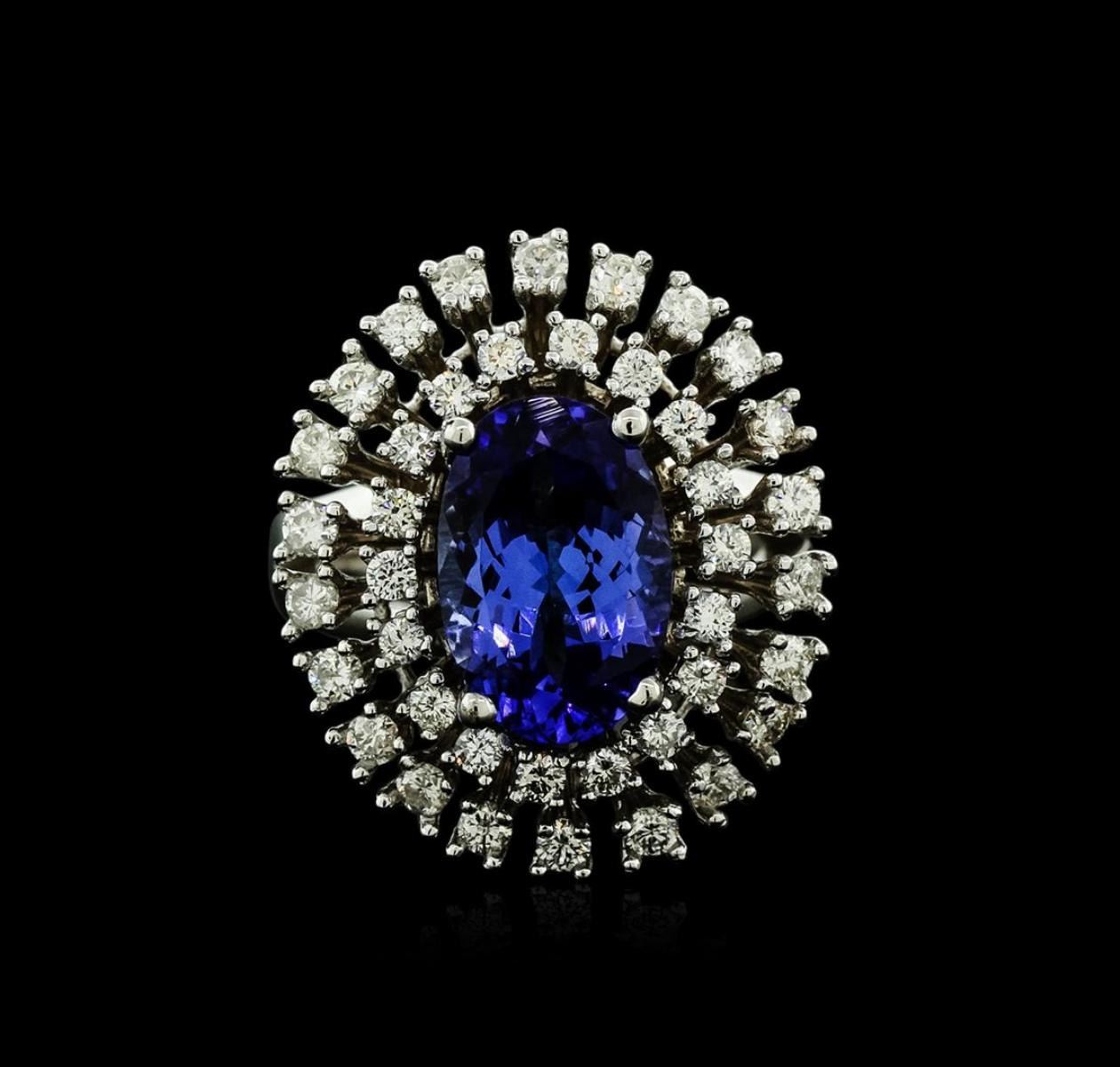One electronically tested 14KT white gold ladies cast tanzanite and diamond ring with a bright polish finish. Identified with markings of "14K". Condition is new. Containing: One prong set oval modified brilliant cut natural tanzanite, measuring 12.70 x 8.50 x 5.53mm, approximate weight of 4.20 ct., clarity is eye clean, type I, medium, moderately strong, violet color, (GIA V 5/4), cut is good. Forty prong set round brilliant cut diamonds, measuring 1.90 - 1.50 x 1.02mm (depth est.) approximate total weight of 40 Stones = 0.72ct. . Clarity: SI-1 to SI-2. Color: I - J, Cut is Good. Colored gemstones are presumed to have been subjected to commonly used enhancement processes. All diamonds and colored gemstones are graded in the mounting, unless otherwise stated.. Total Weight of Colored Stones 4.20 ct.. Total Weight of Diamonds 0.72ct.. Total Weight of Ring 12.50 grams. GGL Appraised.
