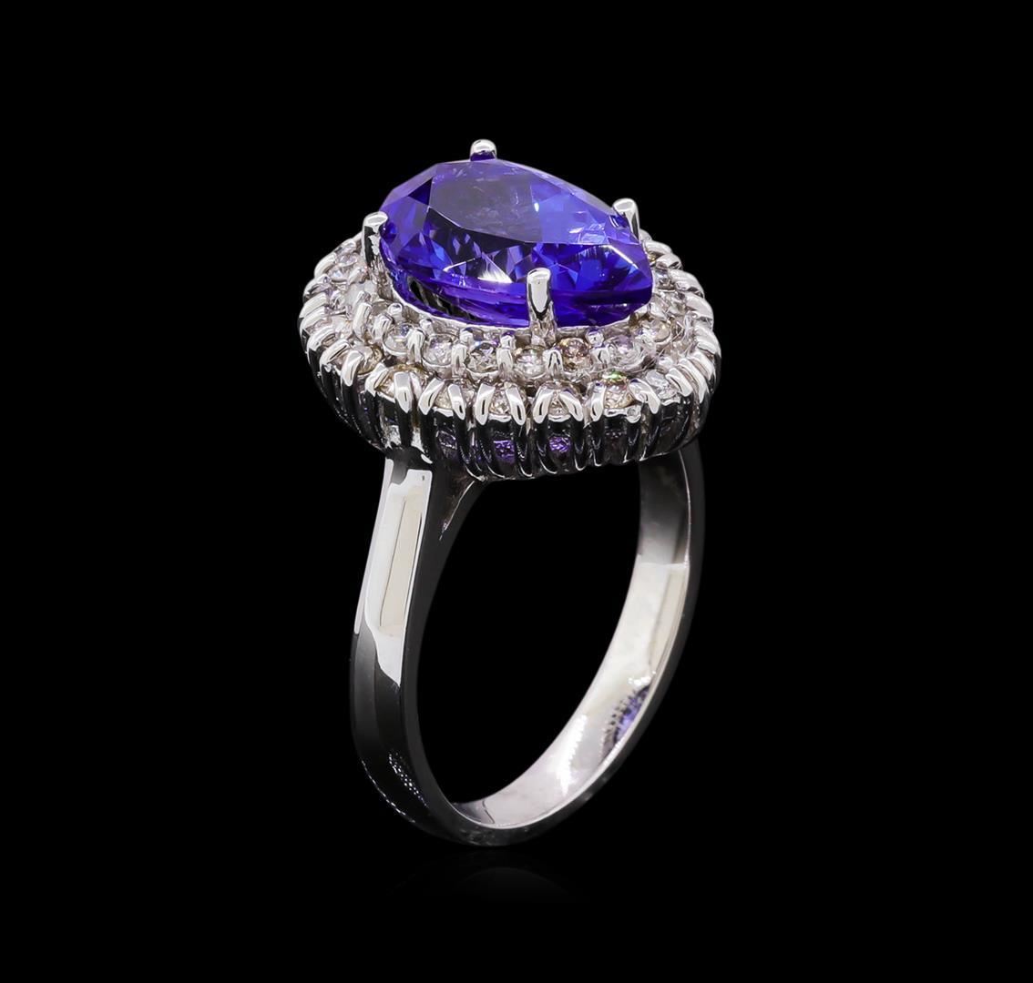 One electronically tested 14KT white gold ladies cast tanzanite and diamond ring with a bright polish finish. Condition is new, good workmanship. The featured tanzanite is set within a two tiered diamond lattice gallery, completed by a two and one-half millimeter wide band. Identified with markings of "K14". Containing: One prong set pear mixed cut natural tanzanite, measuring 12.25 x 8.00 x 6.00mm, 8%. bulge factor, approximate weight of 4.25ct., clarity is eye clean, type I, medium dark, very slightly grayish, bluish violet color, (GIA bV 6/3), cut is good. Transmitting light with no distortion, transparent. Graded in the setting. Tanzanite is a very rare gemstone that is only found in the country of Tanzania. Originally discovered in 1967. Tiffany & Company, named the stone Tanzanite. It is found in the Usumburu Mountains that border the Umba Valley of northern Tanzania. Tanzanite occurs in gray, brown, violet, blue, reddish-purple, & green. The gem is interesting because of its exceptional pleochroism. Rotated in different directions a tanzanite will exhibit multiple changes of color. Tanzanite has a low tolerance to ultrasonic cleaning, and should not be cleaned using this method. Thirty-Nine prong set round brilliant cut diamonds, measuring 1.70 - 1.60 x 0.99mm (depth est.) approximate. Total Weight of 39 Stones = 0.73ct. Faint secondary color throughout. Graded in the setting. Clarity: SI-2 to I-1. Color: J - L. Total Weight of Colored Stones 4.25ct. Total Weight of Diamonds 0.73ct. Total Weight of Ring 6.50 grams. AIG Appraised.