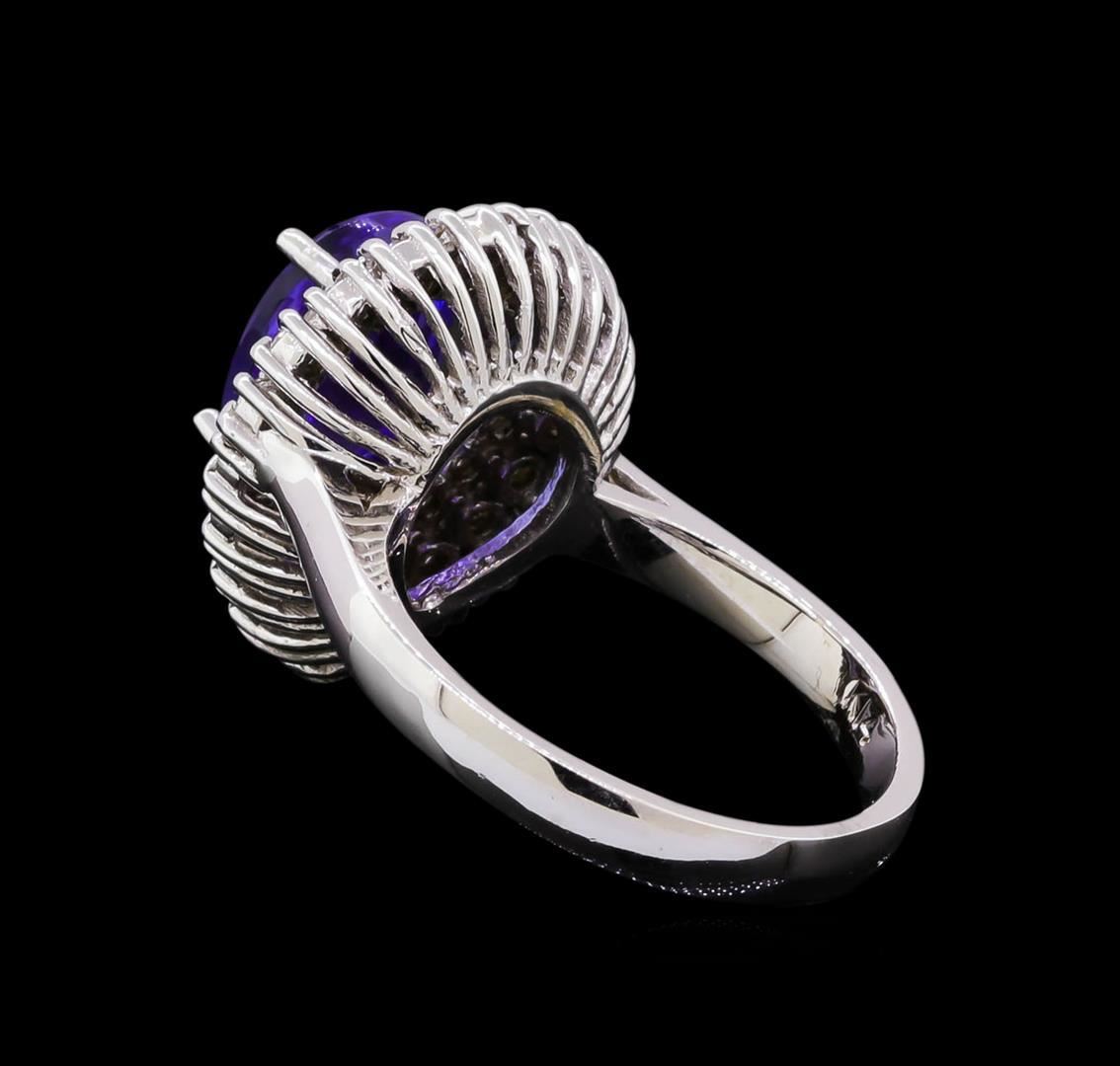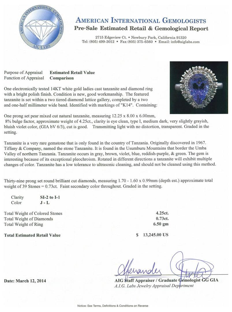 One electronically tested 14KT white gold ladies cast tanzanite and diamond ring with a bright polish finish. Condition is new, good workmanship. The featured tanzanite is set within a two tiered diamond lattice gallery, completed by a two and one-half millimeter wide band. Identified with markings of "K14". Containing: One prong set pear mixed cut natural tanzanite, measuring 12.25 x 8.00 x 6.00mm, 8%. bulge factor, approximate weight of 4.25ct., clarity is eye clean, type I, medium dark, very slightly grayish, bluish violet color, (GIA bV 6/3), cut is good. Transmitting light with no distortion, transparent. Graded in the setting. Tanzanite is a very rare gemstone that is only found in the country of Tanzania. Originally discovered in 1967. Tiffany & Company, named the stone Tanzanite. It is found in the Usumburu Mountains that border the Umba Valley of northern Tanzania. Tanzanite occurs in gray, brown, violet, blue, reddish-purple, & green. The gem is interesting because of its exceptional pleochroism. Rotated in different directions a tanzanite will exhibit multiple changes of color. Tanzanite has a low tolerance to ultrasonic cleaning, and should not be cleaned using this method. Thirty-Nine prong set round brilliant cut diamonds, measuring 1.70 - 1.60 x 0.99mm (depth est.) approximate. Total Weight of 39 Stones = 0.73ct. Faint secondary color throughout. Graded in the setting. Clarity: SI-2 to I-1. Color: J - L. Total Weight of Colored Stones 4.25ct. Total Weight of Diamonds 0.73ct. Total Weight of Ring 6.50 grams. AIG Appraised.