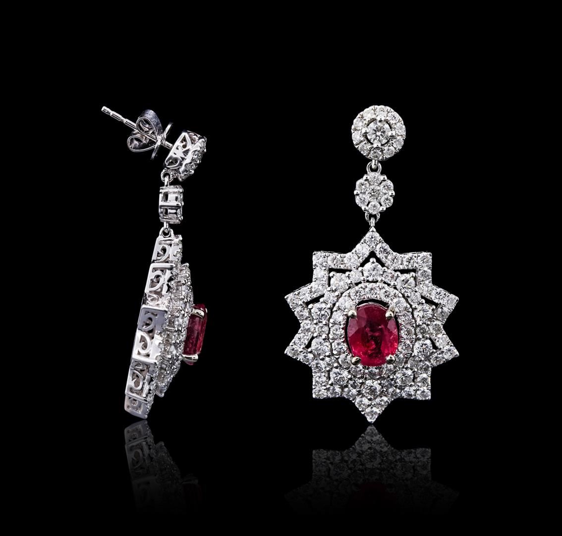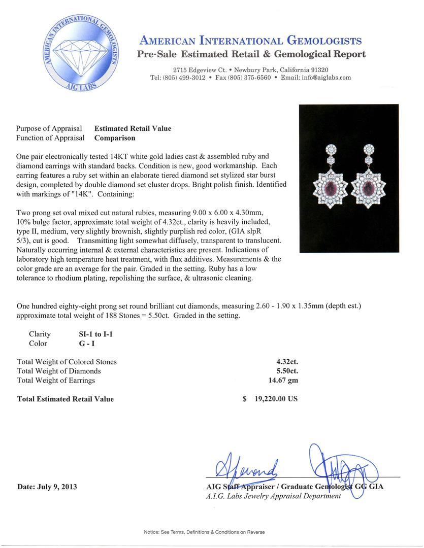 One pair electronically tested 14KT white gold ladies cast & assembled ruby and diamond earrings with standard backs. Condition is new, good workmanship. Each earring features a ruby set within an elaborate tiered diamond set stylized star burst design, completed by double diamond set cluster drops. Bright polish finish. Identified with markings of "14K". Containing: Two prong set oval mixed cut natural rubies, measuring 9.00 x 6.00 x 4.30mm, 10% bulge factor, approximate total weight of 4.32ct., clarity is heavily included, type II, medium, very slightly brownish, slightly purplish red color, (GIA slpR 5/3), cut is good. Transmitting light somewhat diffusely, transparent to translucent. Naturally occurring internal & external characteristics are present. Indications of laboratory high temperature heat treatment, with flux additives. Measurements & the color grade are an average for the pair. Graded in the setting. Ruby has a low tolerance to rhodium plating, repolishing the surface, & ultrasonic cleaning. One hundred eighty-eight prong set round brilliant cut diamonds, measuring 2.60 -- 1.90 x 1.35mm (depth est.) approximate total weight of 188 stones = 5.50ct. Graded in the setting. Clarity SI-1 to I-1. Color G-I. Total weight of Ruby 4.32ct. Total weight of Diamonds 5.50ct. Total weight of Earrings 14.67gm. AIG Appraised at $19,220.00.