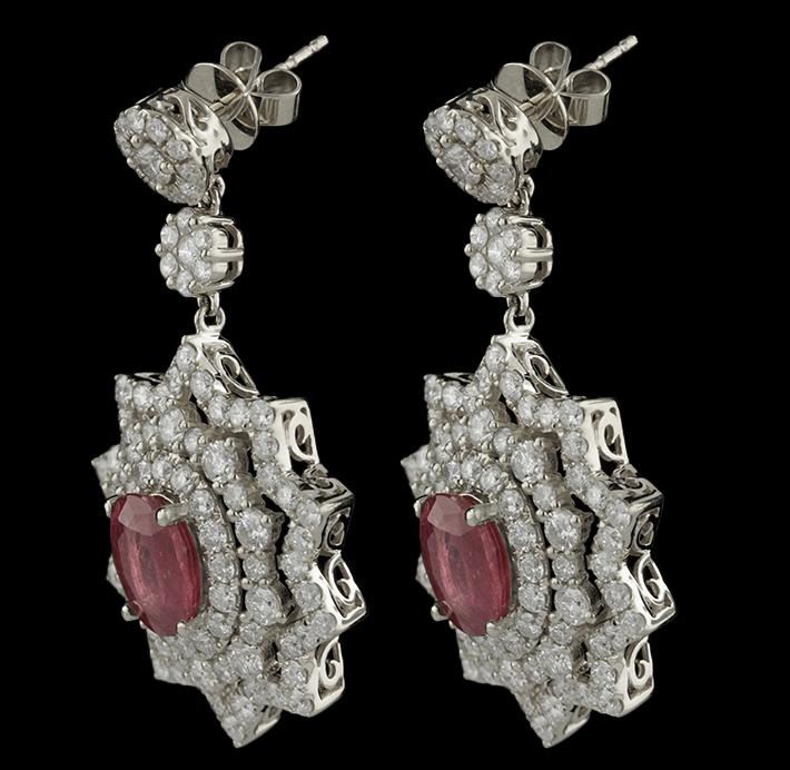 One pair electronically tested 14KT white gold ladies cast & assembled ruby and diamond earrings with standard backs. Condition is new, good workmanship. Each earring features a ruby set within an elaborate tiered diamond set stylized star burst design, completed by double diamond set cluster drops. Bright polish finish. Identified with markings of "14K". Containing: Two prong set oval mixed cut natural rubies, measuring 9.00 x 6.00 x 4.30mm, 10% bulge factor, approximate total weight of 4.32ct., clarity is heavily included, type II, medium, very slightly brownish, slightly purplish red color, (GIA slpR 5/3), cut is good. Transmitting light somewhat diffusely, transparent to translucent. Naturally occurring internal & external characteristics are present. Indications of laboratory high temperature heat treatment, with flux additives. Measurements & the color grade are an average for the pair. Graded in the setting. Ruby has a low tolerance to rhodium plating, repolishing the surface, & ultrasonic cleaning. One hundred eighty-eight prong set round brilliant cut diamonds, measuring 2.60 -- 1.90 x 1.35mm (depth est.) approximate total weight of 188 stones = 5.50ct. Graded in the setting. Clarity SI-1 to I-1. Color G-I. Total weight of Ruby 4.32ct. Total weight of Diamonds 5.50ct. Total weight of Earrings 14.67gm. AIG Appraised at $19,220.00.