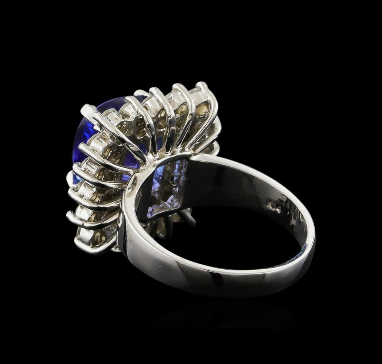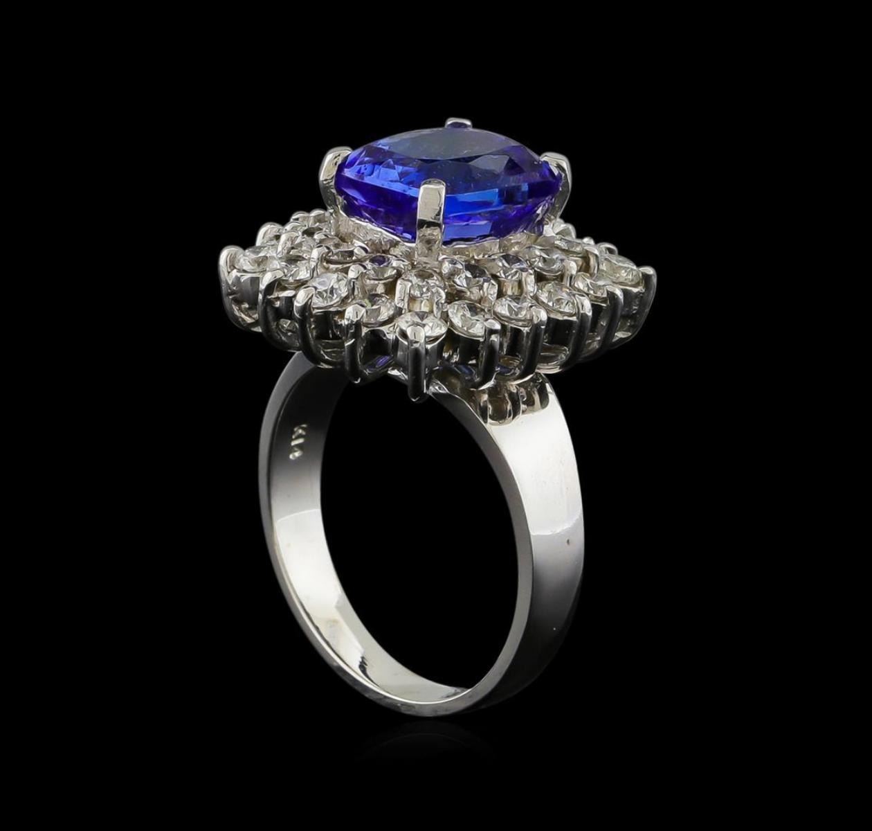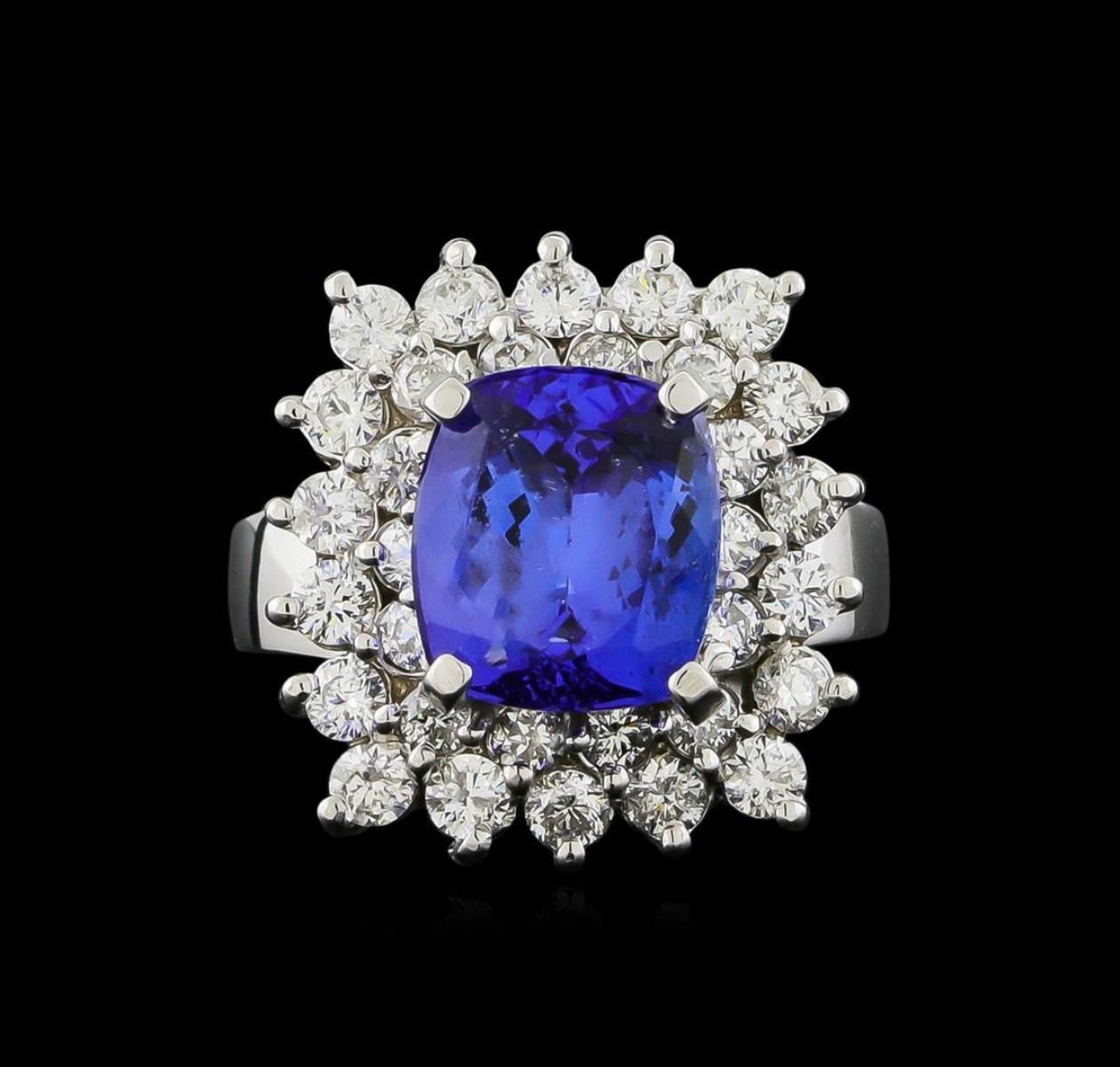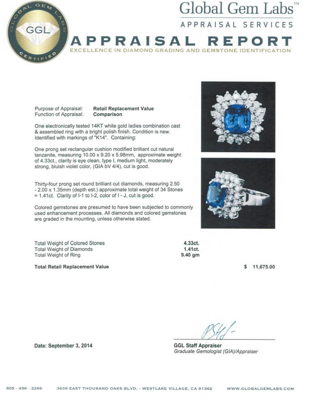 One electronically tested 14KT white gold ladies combination cast & assembled ring with a bright polish finish. Identified with markings of "K14". Condition is new. Containing: One prong set rectangular cushion modified brilliant cut natural tanzanite, measuring 10.00 x 9.20 x 5.98mm, approximate weight of 4.33ct., clarity is eye clean, type I, medium light, moderately strong, bluish violet color, (GIA bV 4/4), cut is good. Thirty-Four prong set round brilliant cut diamonds, measuring 2.50 - 2.00 x 1.35mm (depth est.) approximate total weight of 34 Stones = 1.41ct. Clarity: I-1 to I-2. Color: I - J, Cut is Good. Colored gemstones are presumed to have been subjected to commonly used enhancement processes. All diamonds and colored gemstones are graded in the mounting, unless otherwise stated. Total Weight of Colored Stones 4.33ct. Total Weight of Diamonds 1.41ct. Total Weight of Ring 9.40 grams. GGL Appraised.