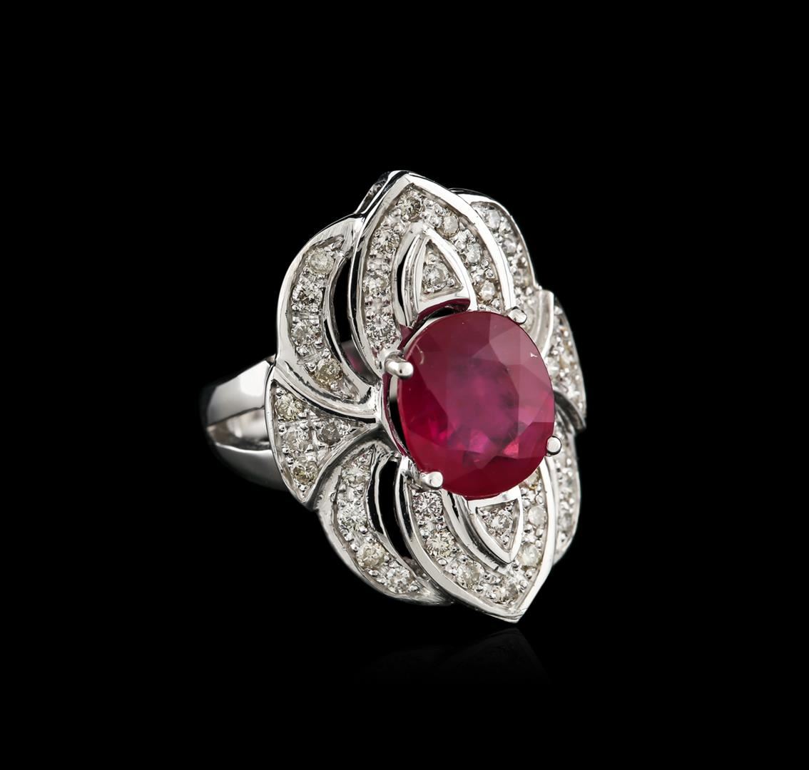 One electronically tested 14KT white gold ladies cast ruby and diamond ring with a bright polish finish. Identified with markings of "14K". Condition is new. Containing: One prong set oval modified brilliant cut natural ruby, measuring 10.93 x 9.51 x 5.00mm, approximate weight of 4.42ct., clarity is heavily included, medium dark, moderately strong, strongly purplish red color, (GIA stpR 6/4), cut is good. Forty prong set round brilliant cut diamonds, measuring 1.50 - 1.50 x 0.90mm (depth est.) approximate total weight of 40 Stones = 0.49ct. Clarity: I-1 to I-2. Color: I - J, Cut is Good. All diamonds and colored gemstones are graded in the mounting, unless otherwise stated. Colored gemstones are presumed to have been subjected to commonly used enhancement processes. Total Weight of Colored Stones 4.42ct. Total Weight of Diamonds 0.49ct. Total Weight of Ring 10.20 grams. GGL Appraised at $3,180.00.