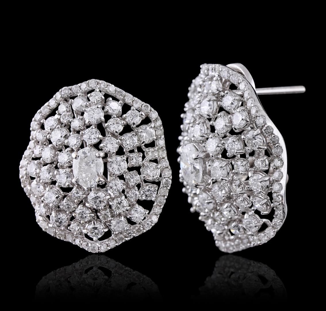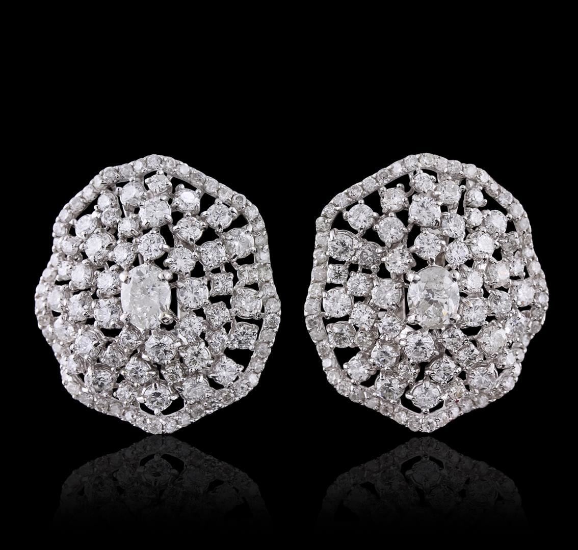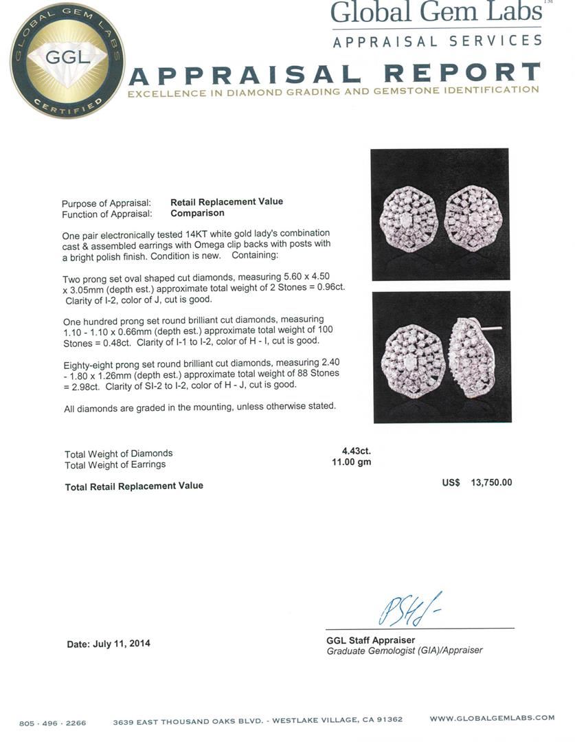 One pair electronically tested 14KT white gold Ladies combination cast & assembled earrings with Omega clip backs with posts with a bright polish finish. Condition is new. Containing: Two prong set oval shaped cut diamonds, measuring 5.60 x 4.50 x 3.05mm (depth est.) approximate. Total Weight of 2 Stones = 0.96ct. Clarity: I-2. Color: J, Cut is Good. One Hundred prong set round brilliant cut diamonds, measuring 1.10 - 1.10 x 0.66mm (depth est.) approximate. Total Weight of 100 Stones = 0.48ct. Clarity: I-1 to I-2. Color: H - I, Cut is Good. Eighty-Eight prong set round brilliant cut diamonds, measuring 2.40 - 1.80 x 1.26mm (depth est.) approximate. Total Weight of 88 Stones = 2.98ct. Clarity: SI-2 to I-2. Color: H - J, Cut is Good. All diamonds are graded in the mounting, unless otherwise stated. Total Weight of Diamonds 4.43ct. Total Weight of Earrings 11.00 grams. GGL Appraised.