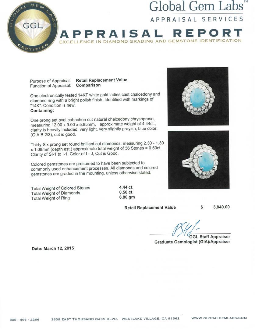 One electronically tested 14KT white gold ladies cast chalcedony and diamond ring with a bright polish finish. Identified with markings of "14K". Condition is new. Containing: One prong set oval cabochon cut natural chrysoprase, measuring 12.00. x 9.00. x 5.85mm, approximate weight of 4.44ct., clarity is heavily included, very light, very slightly grayish, blue color, (GIA B 2/3), cut is good. Thirty-Six prong set round brilliant cut diamonds, measuring 2.30 - 1.30 x 1.08mm (depth est.) approximate total weight of 36 Stones = 0.50ct. Clarity: SI-1 to I-1. Color: I - J, Cut is Good. Colored gemstones are presumed to have been subjected to commonly used enhancement processes. All diamonds and colored gemstones are graded in the mounting, unless otherwise stated. Total Weight of Colored Stones 4.44ct. Total Weight of Diamonds 0.50ct. Total Weight of Ring 8.80 grams. GGL Appraised at $3,840.00.