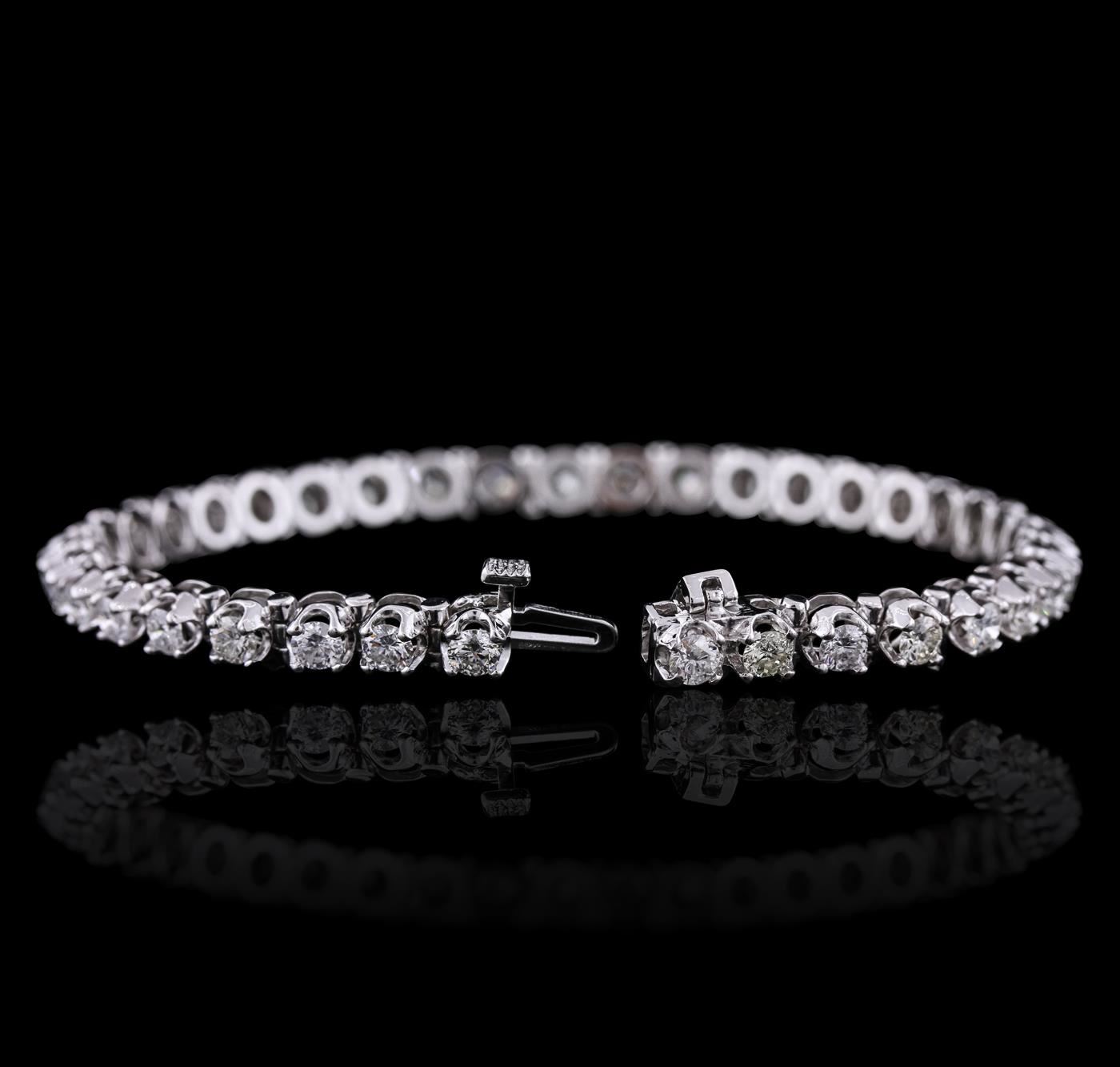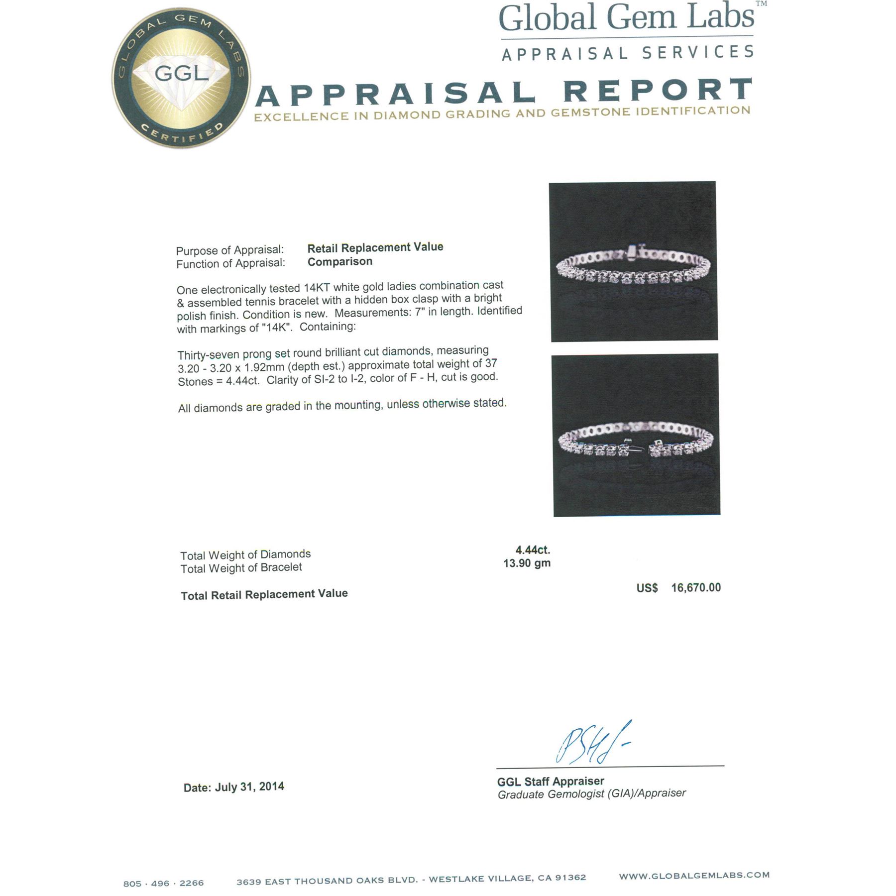 One electronically tested 14KT white gold ladies combination cast & assembled tennis bracelet with a hidden box clasp with a bright polish finish. Condition is new. Measurements: 7" in length. Identified with markings of "14K". Containing: Thirty-Seven prong set round brilliant cut diamonds, measuring 3.20 - 3.20 x 1.92mm (depth est.) approximate. Total Weight of 37 Stones = 4.44ct. Clarity: SI-2 to I-2. Color: F - H, Cut is Good. All diamonds are graded in the mounting, unless otherwise stated. Total Weight of Diamonds 4.44ct. Total Weight of Bracelet 13.90 grams. GGL Appraised at $16,670.00.