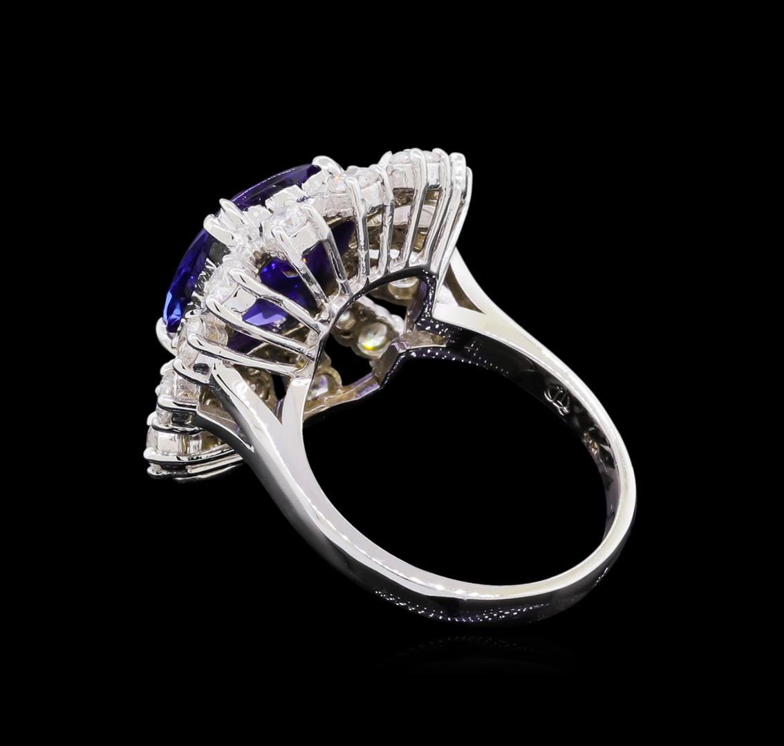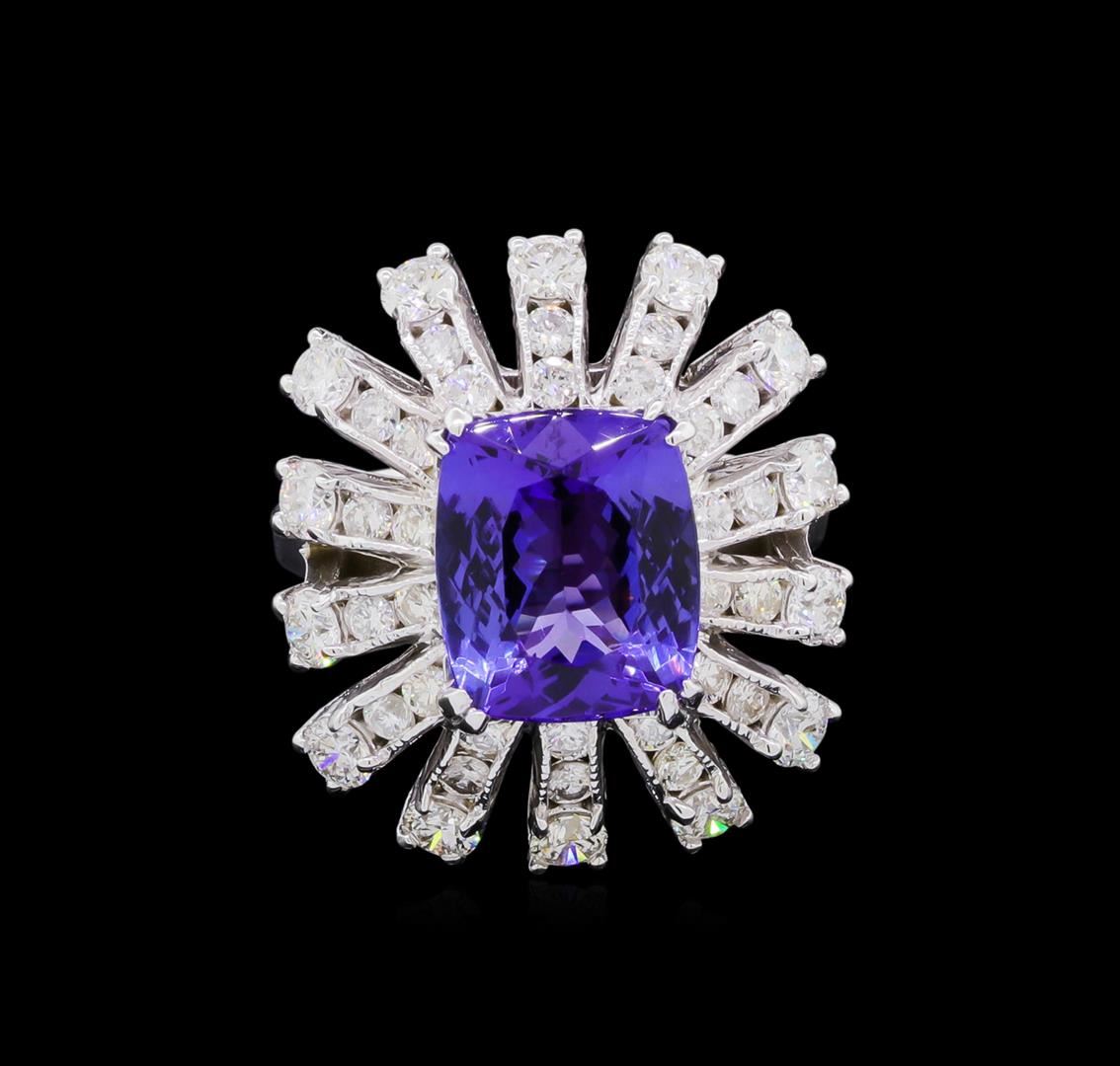 One polished, stamped, and electronically tested solid 14KT White Gold ring mounted with: 1 genuine tanzanite center stone weighing 4.46 carats and 42 genuine round diamonds weighing 1.94 carats. This item weighs 7.5 grams, condition is new, excellent workmanship. AIGL Appraised at $11,100.00.