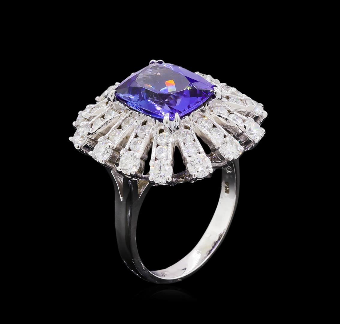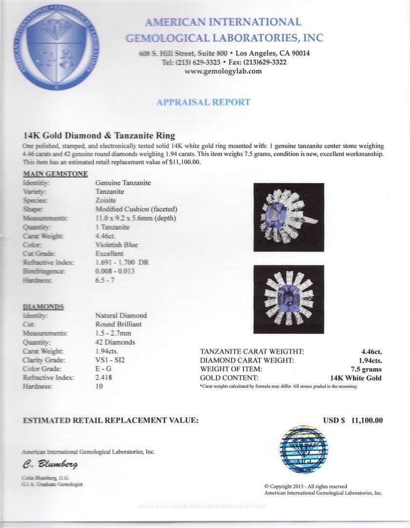 One polished, stamped, and electronically tested solid 14KT White Gold ring mounted with: 1 genuine tanzanite center stone weighing 4.46 carats and 42 genuine round diamonds weighing 1.94 carats. This item weighs 7.5 grams, condition is new, excellent workmanship. AIGL Appraised.